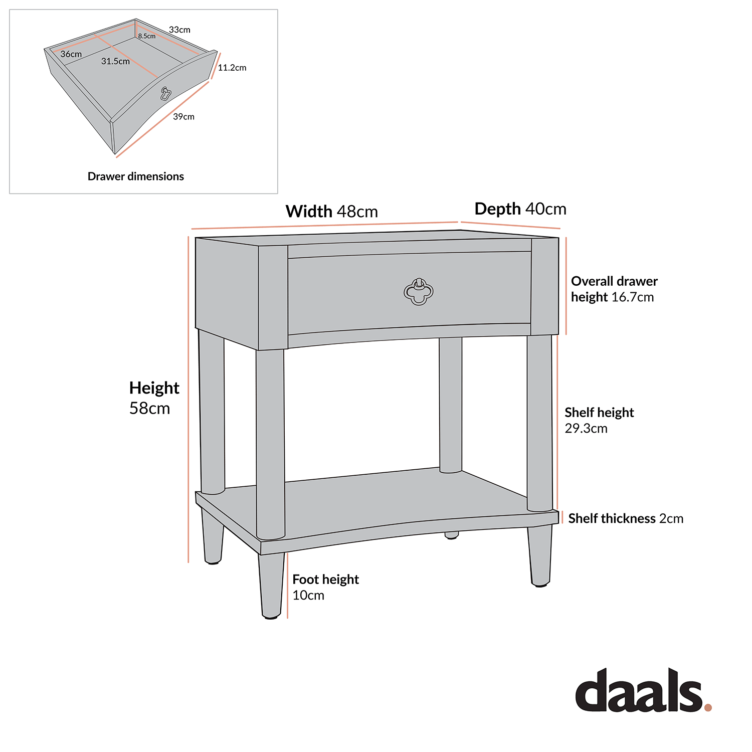 - 1 drawer and 1 shelf offer convenient bedside storage.