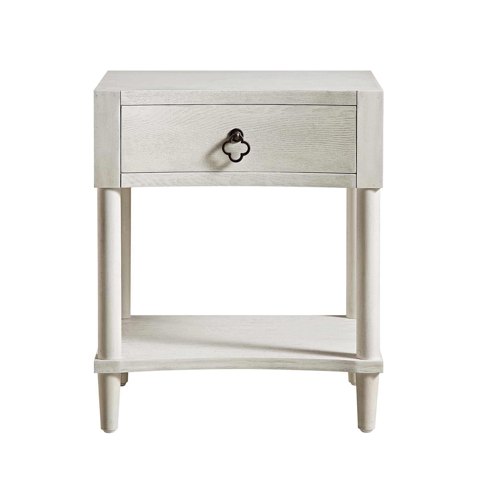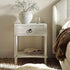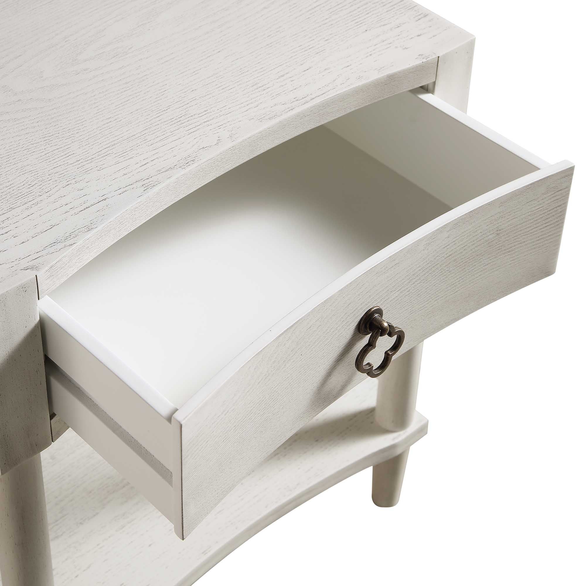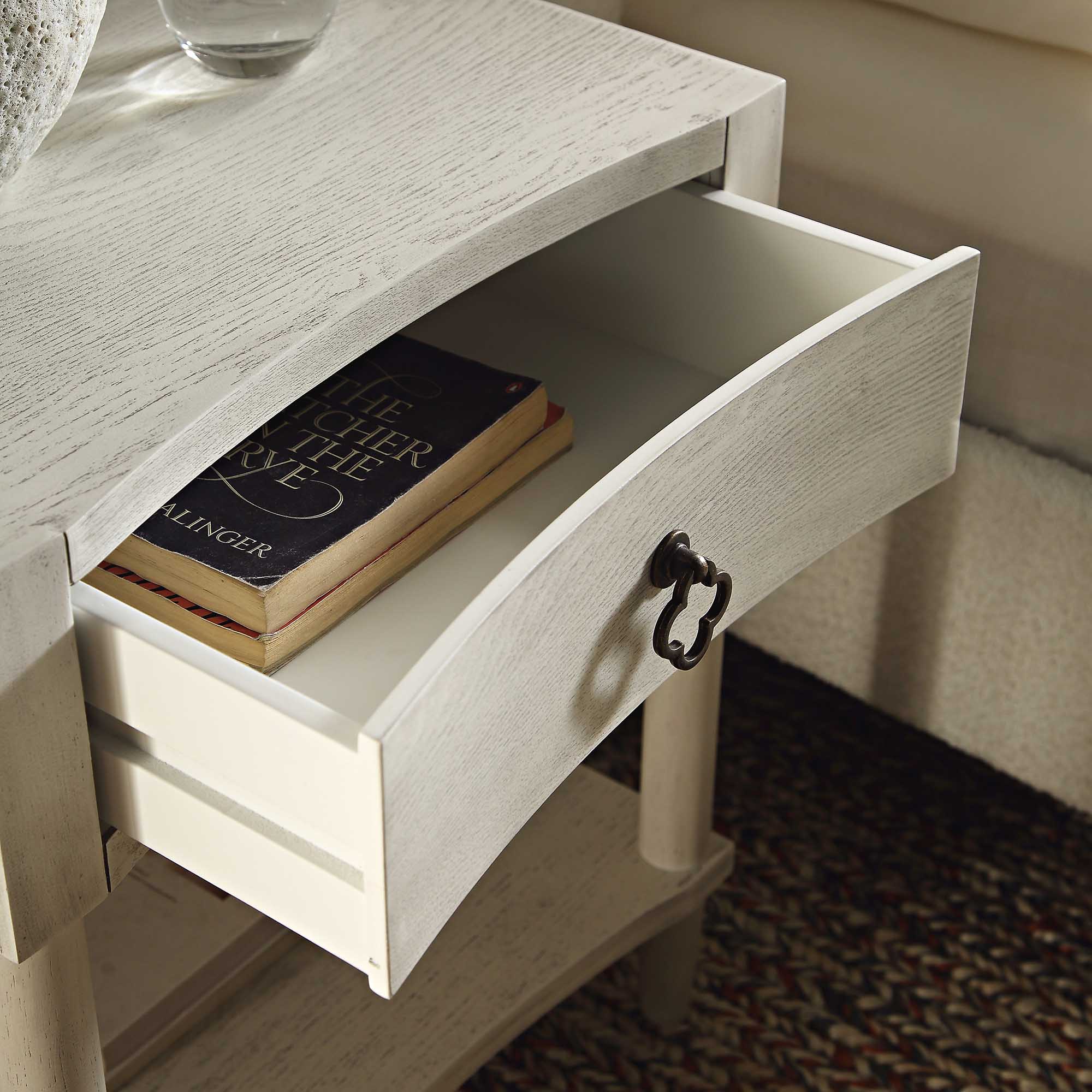 - Featuring distinctive curved design, our Thalia bedside table is crafted from solid ash veneer in a beautiful whitewashed finish.