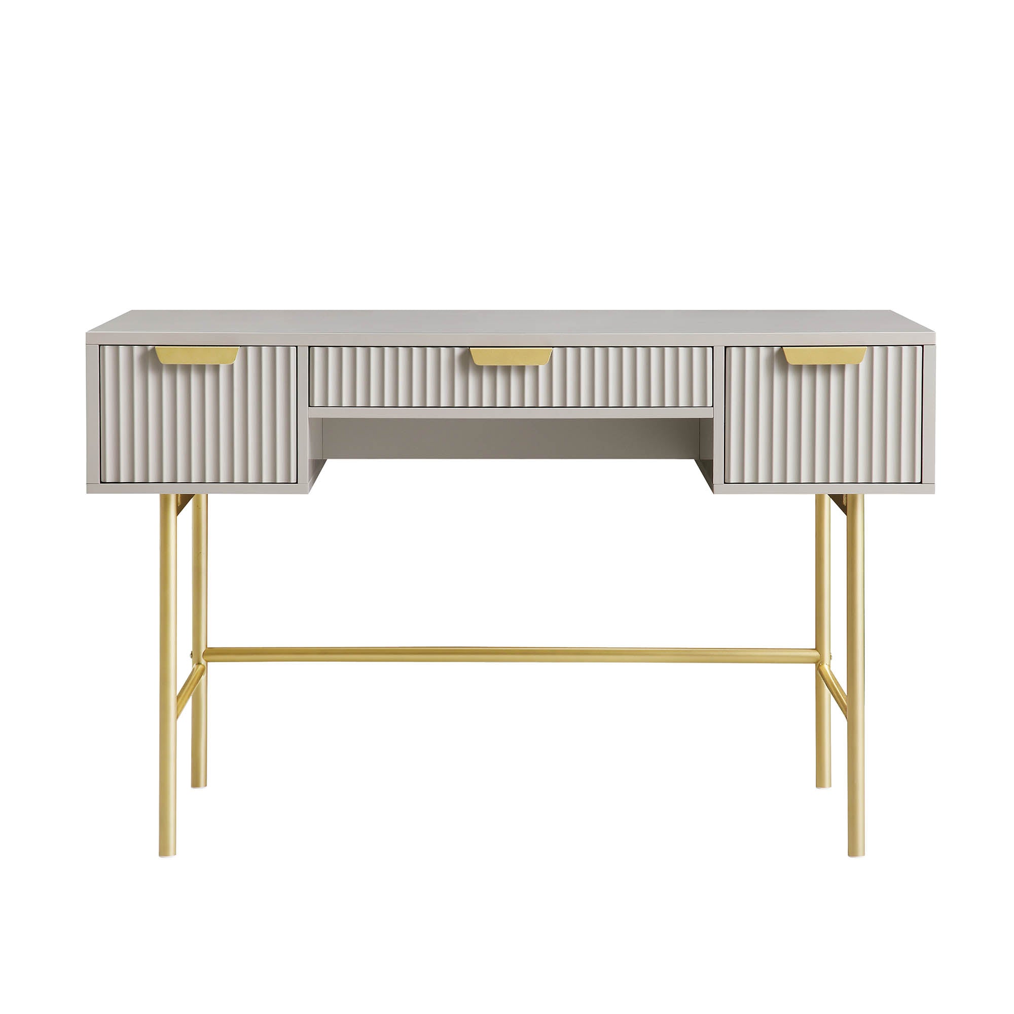 - The dressing table features 3 drawers with a ridged front finished in matte taupe paint, paired with gold handles and legs.