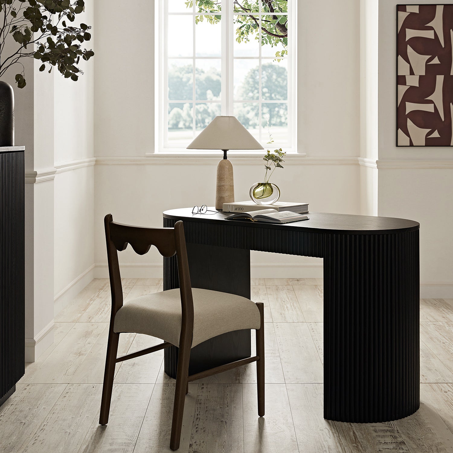 - Bold yet refined, our Maru Writing Desk in Black Oak brings sculptural texture and everyday function into elegant balance.