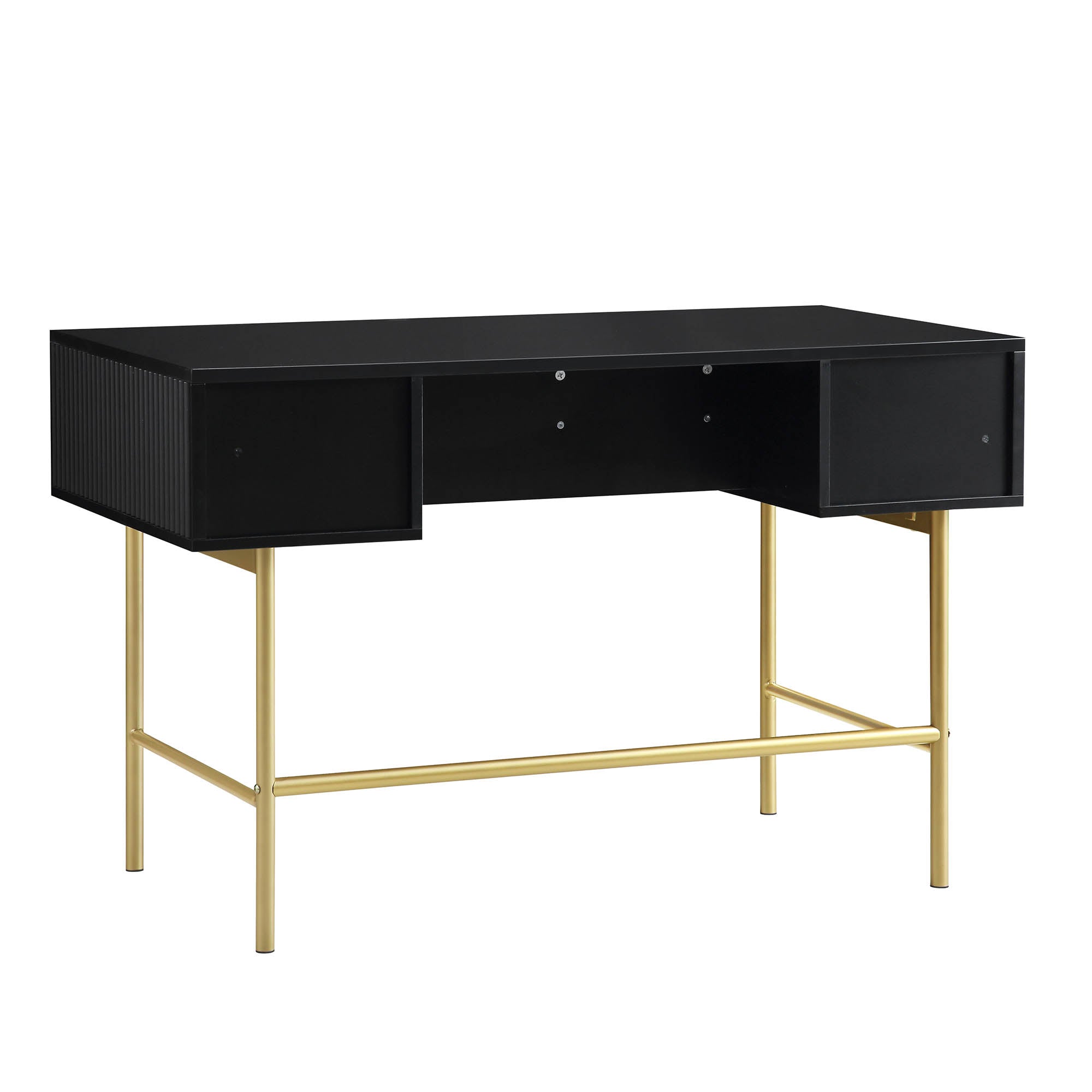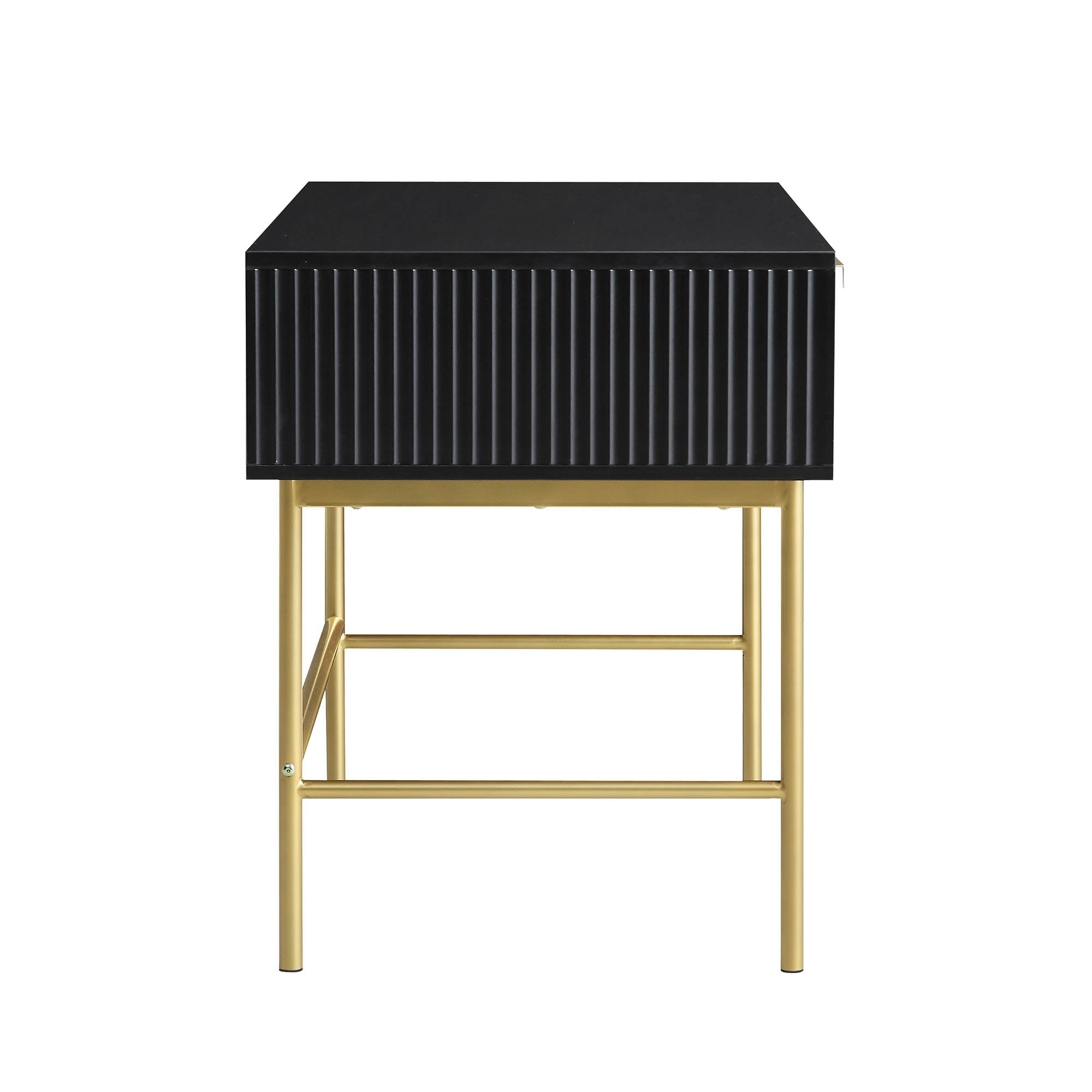 - The dressing table features 3 drawers with a ridged front finished in matte black paint, paired with gold handles and legs.