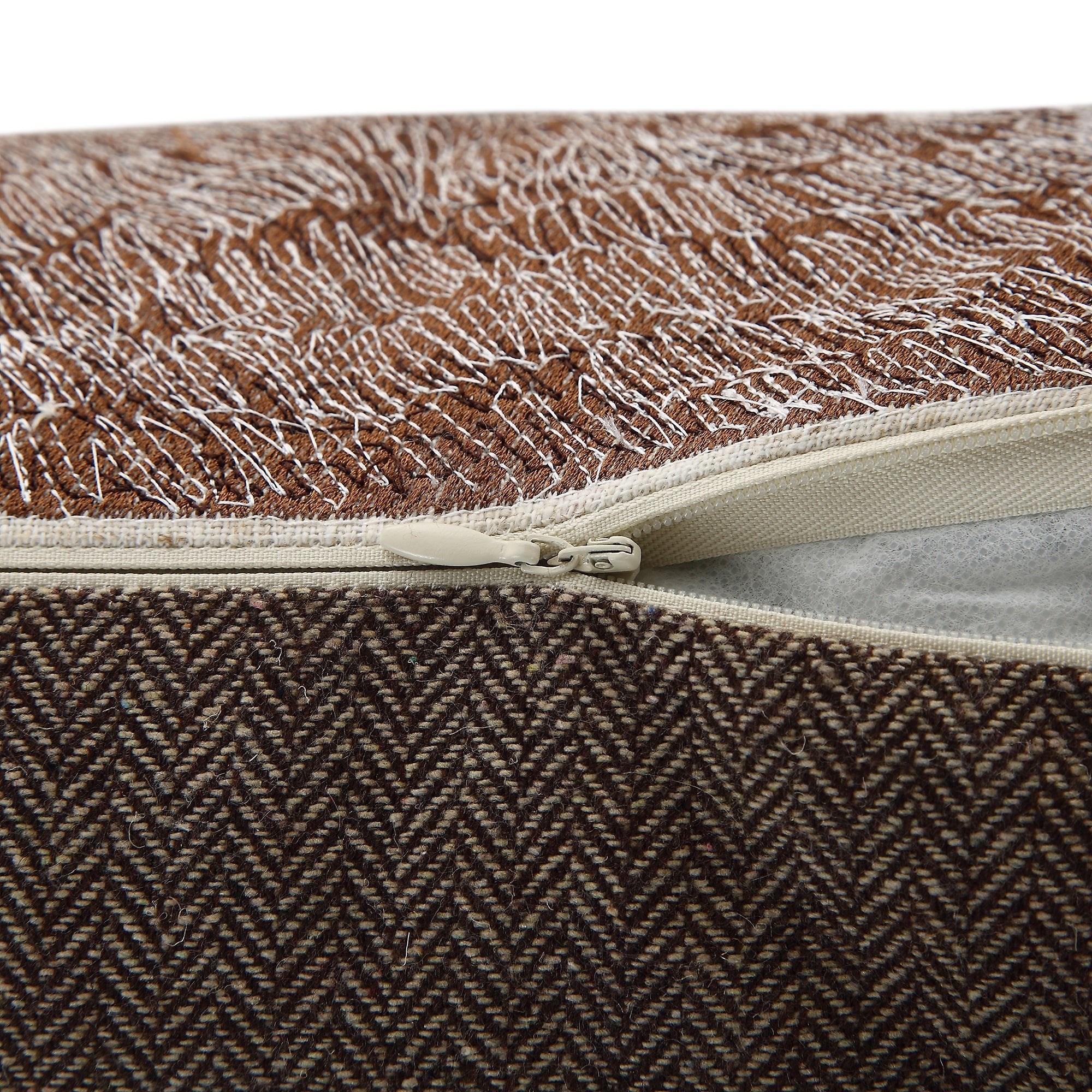 - The Linen blend base has been intricately embroidered, the edges have been finished off with a grey pompom trim and the contrast of the brown herringbone reverse really adds to the country feel.