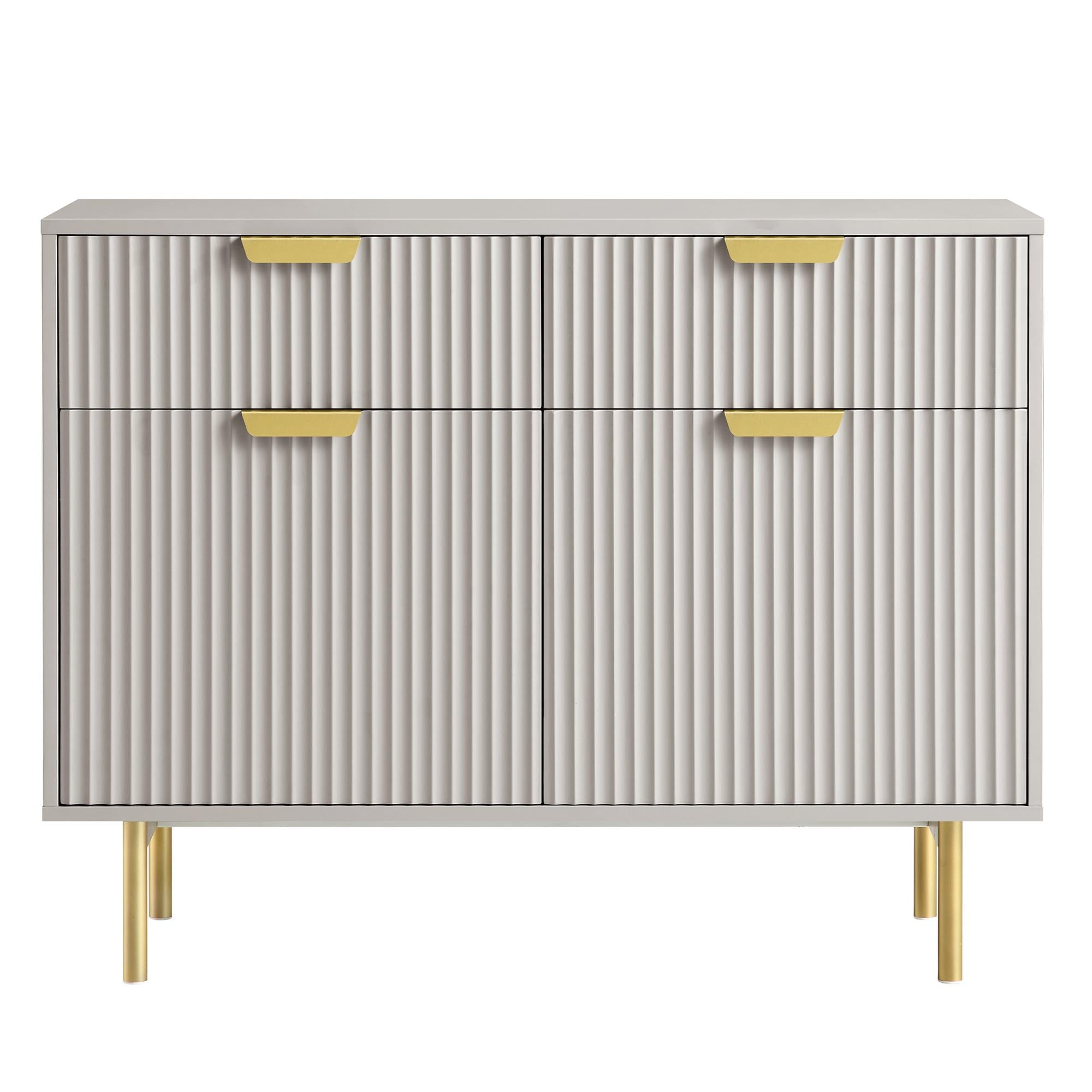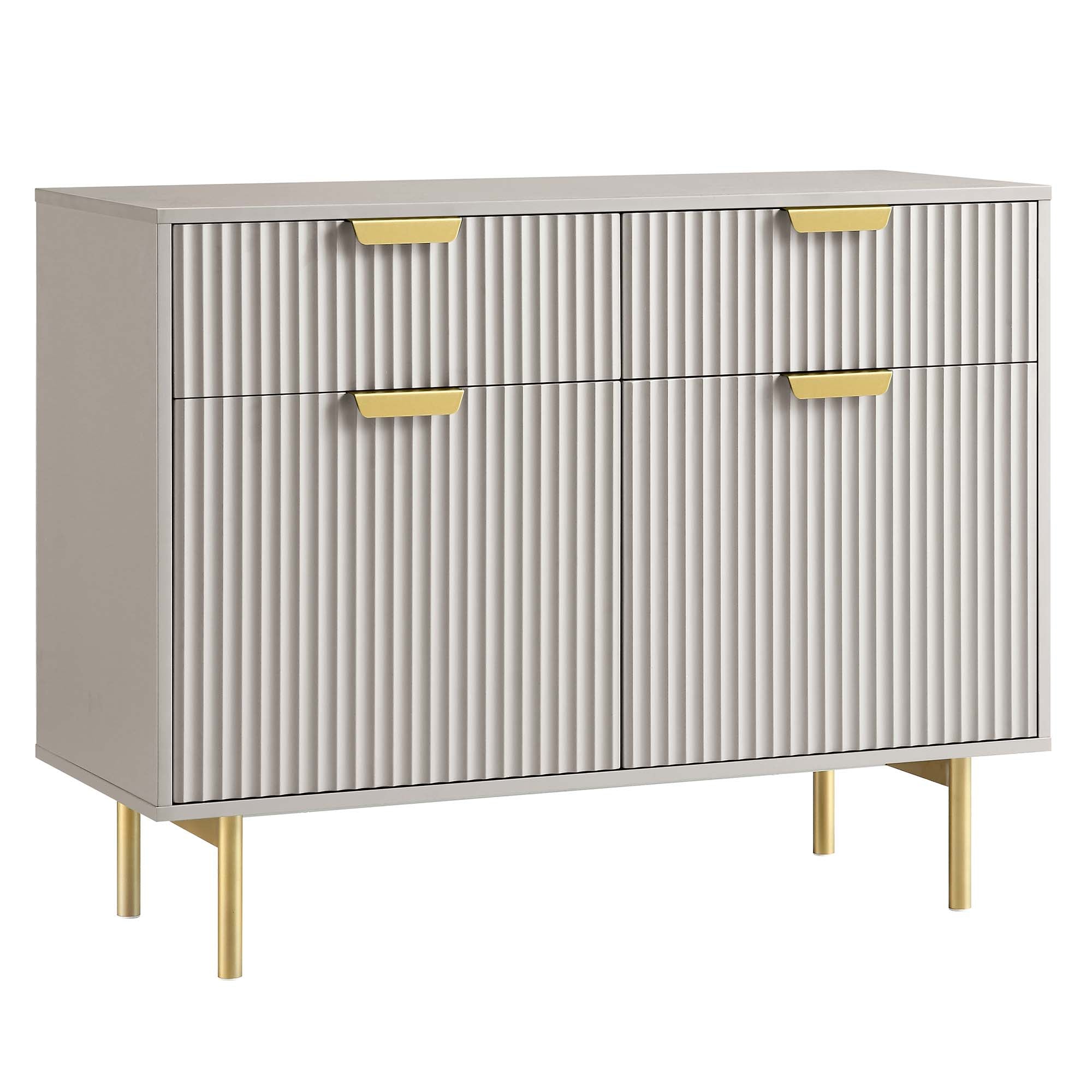 - The cabinet features a ridged surface on the doors and drawer fronts, finished in matte taupe paint