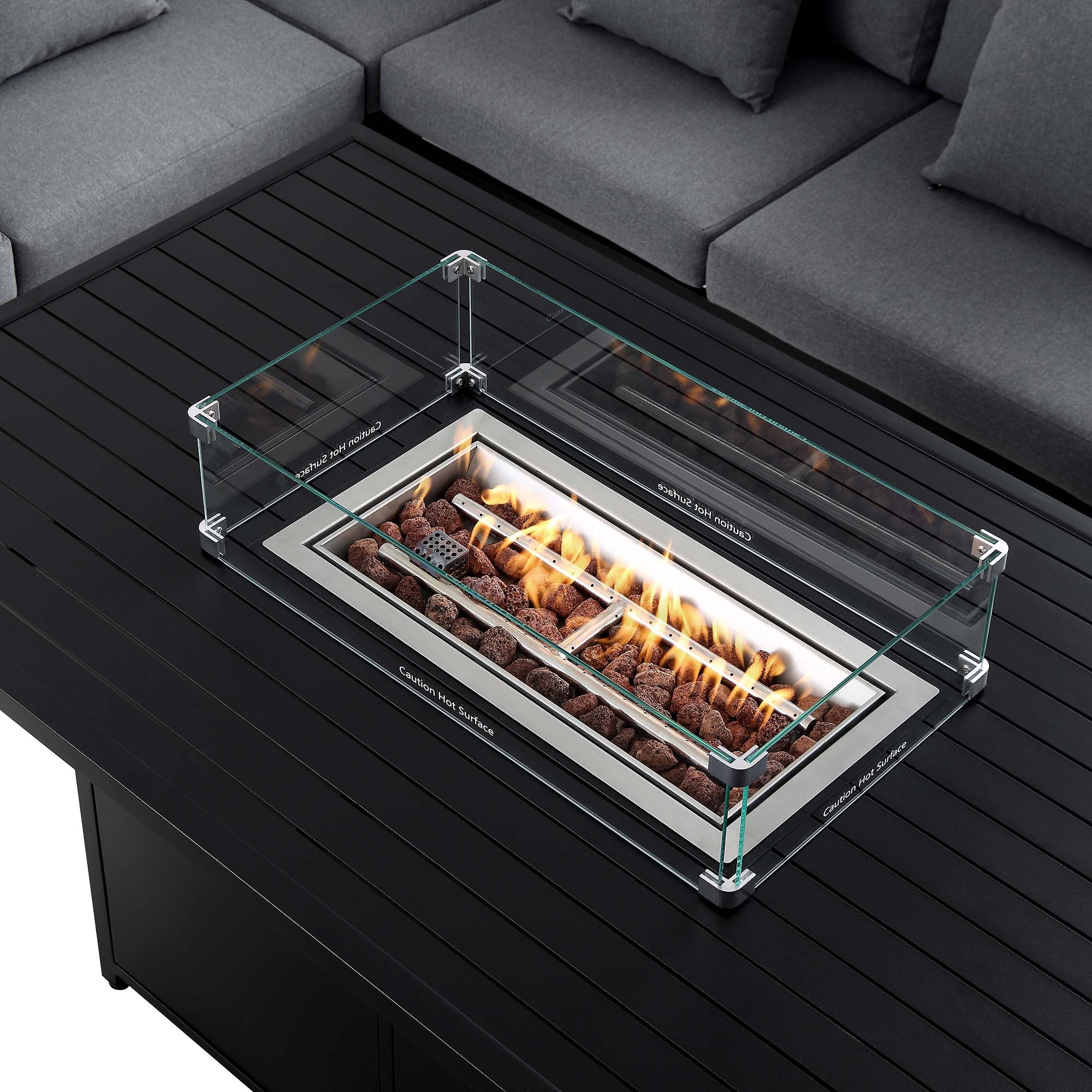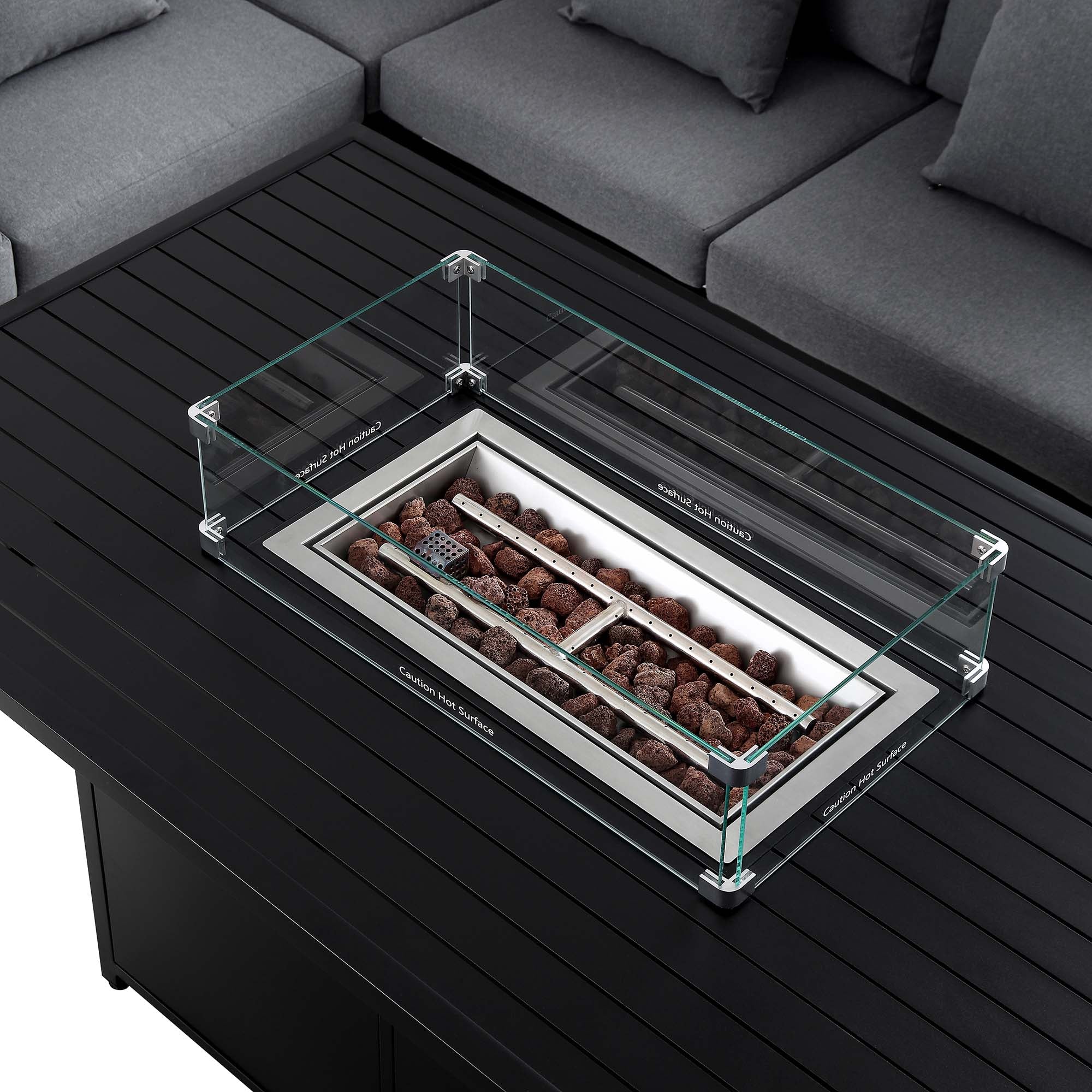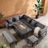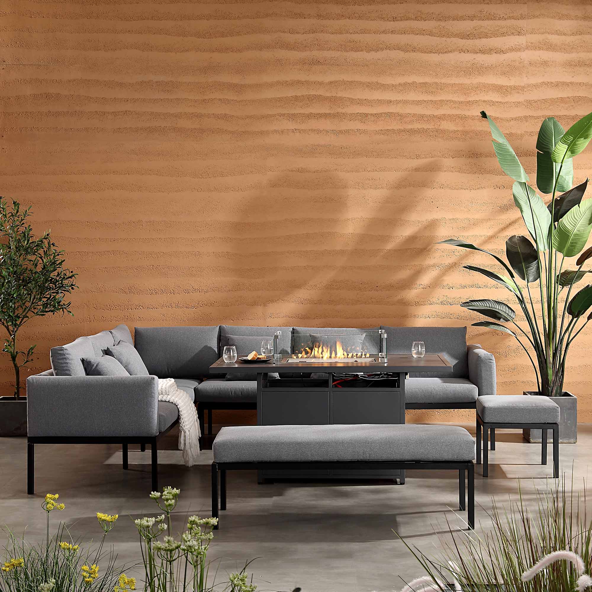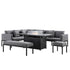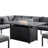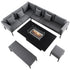 Calabasas Large Outdoor Fabric and Aluminium Corner Casual Dining Set with Firepit Table, Dark Grey
