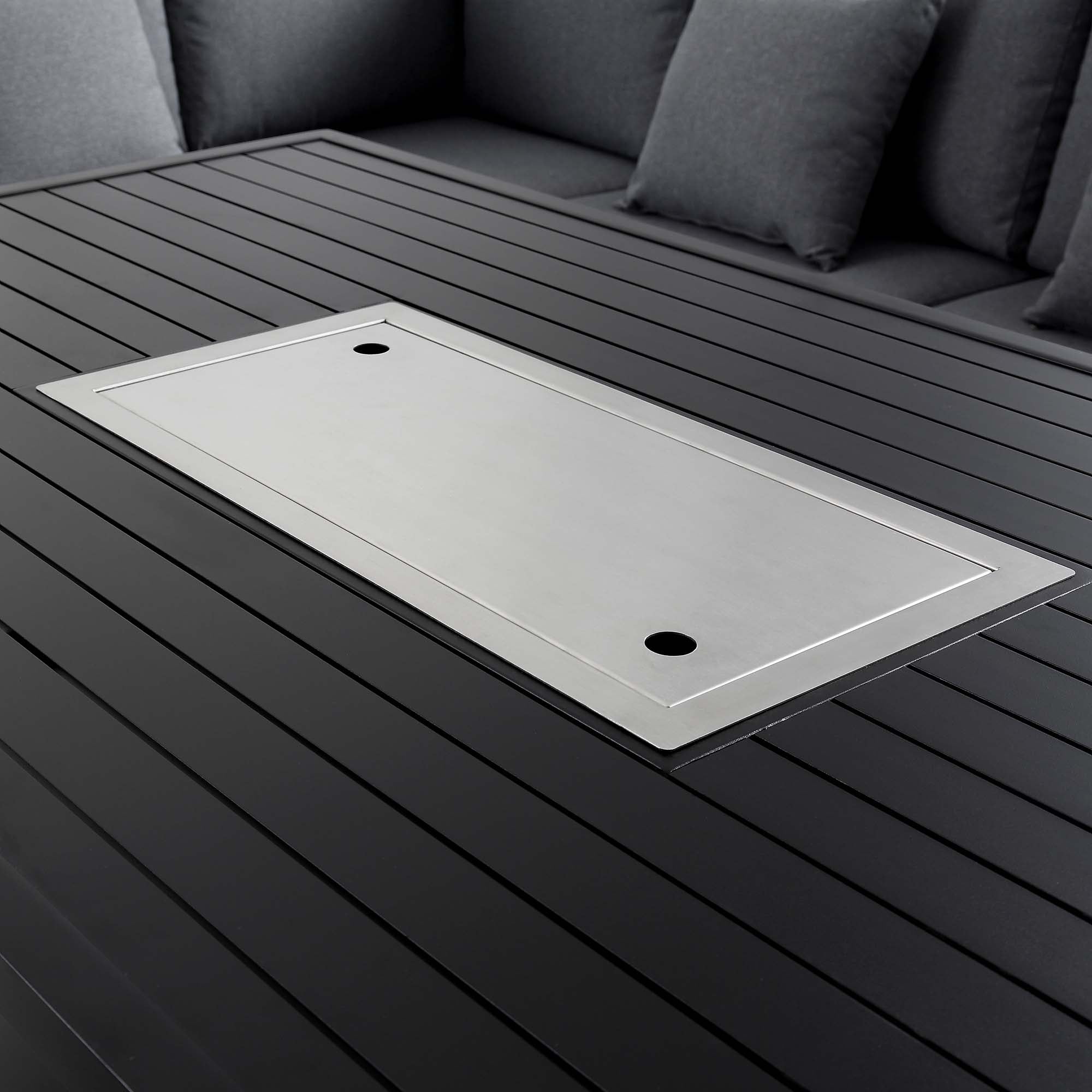 - Complete the look: Pictured with our Calabasas Large Outdoor Fabric and Aluminium Corner Casual Dining Set with Firepit Table is our 300cm Large Square 360° Aluminium Roma Cantilever Garden Hanging Parasol in Grey.