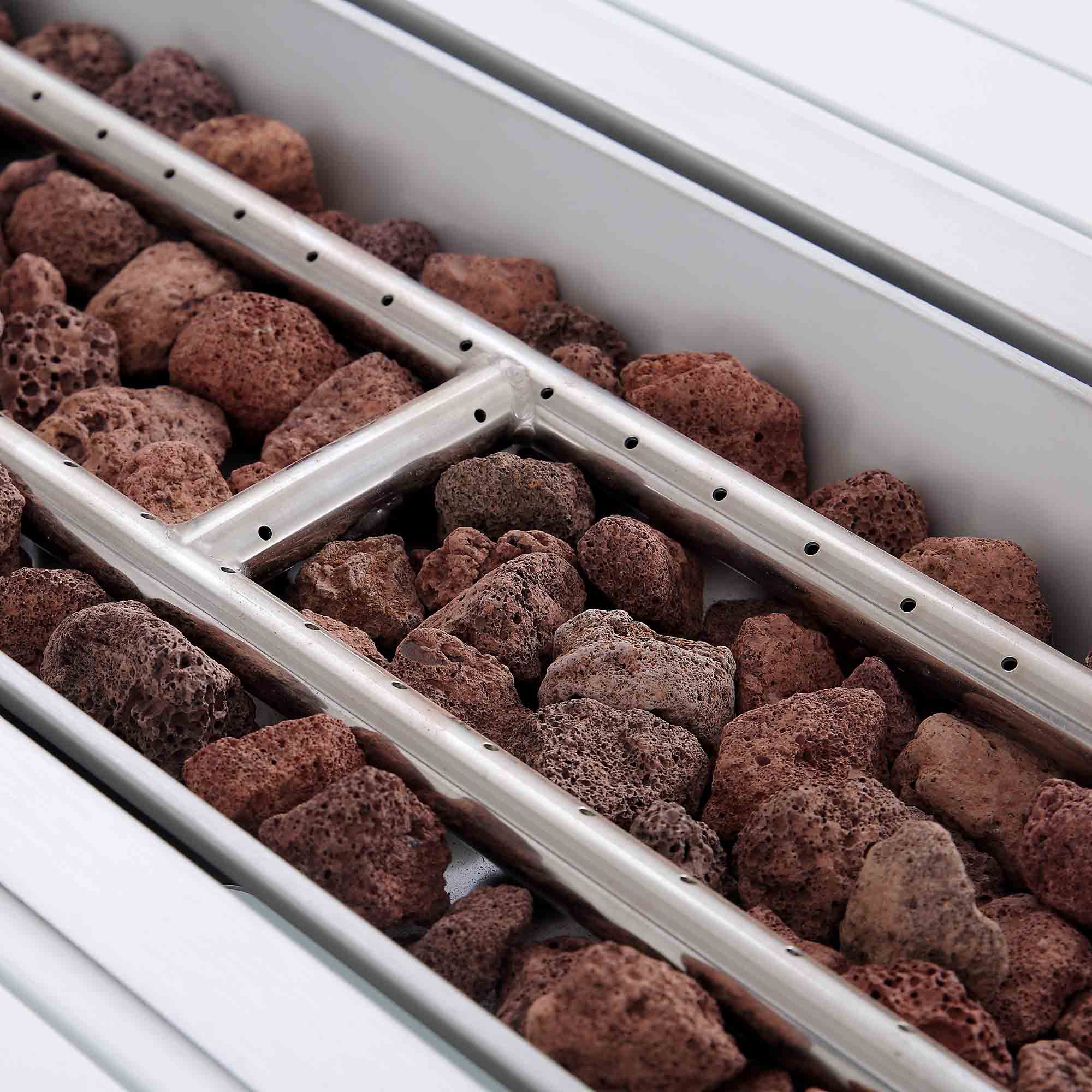 - Perfect for use in the evenings, the firepit table is made from 201 stainless steel and comes with a lid, a protective glass windshield as well as 3kgs of lava rock