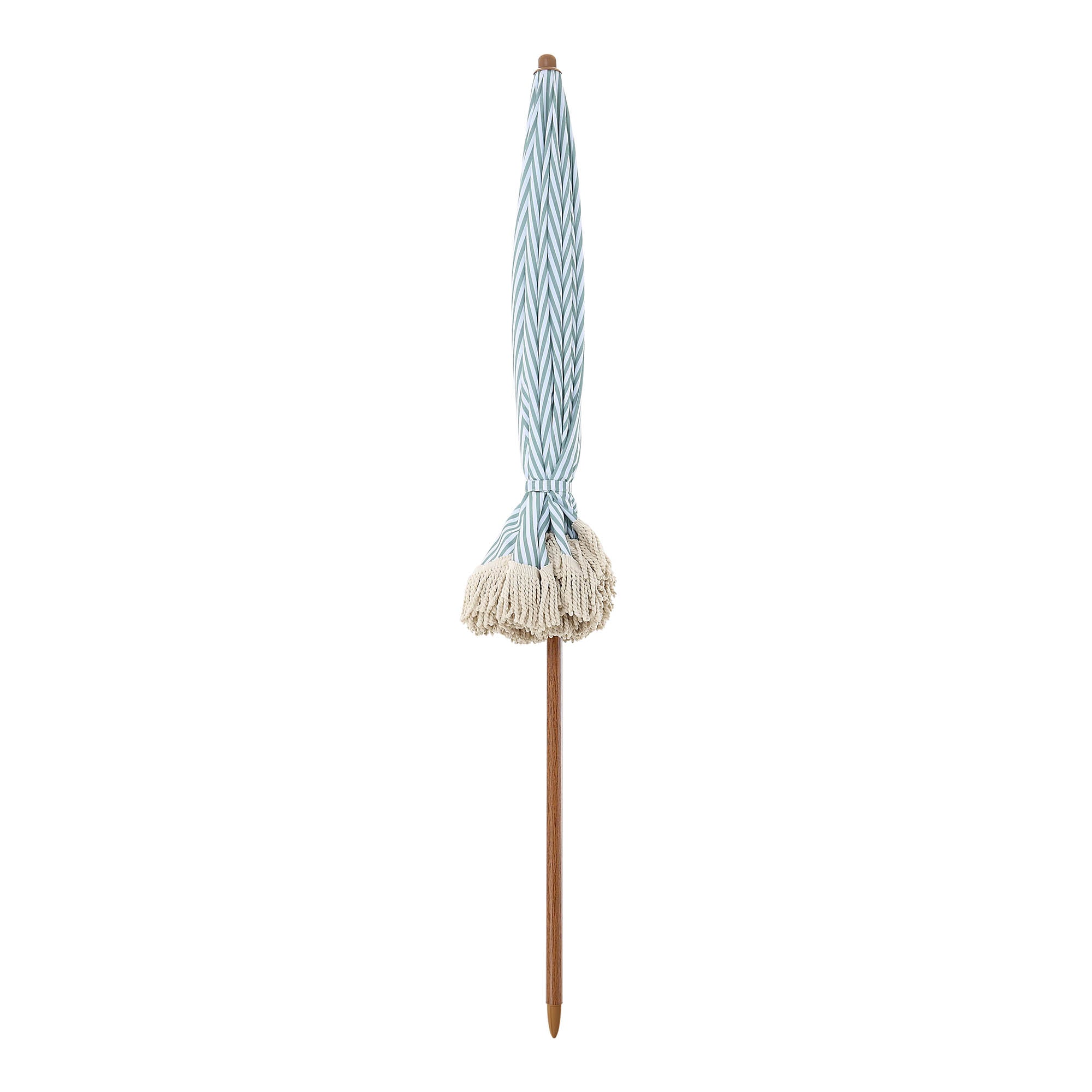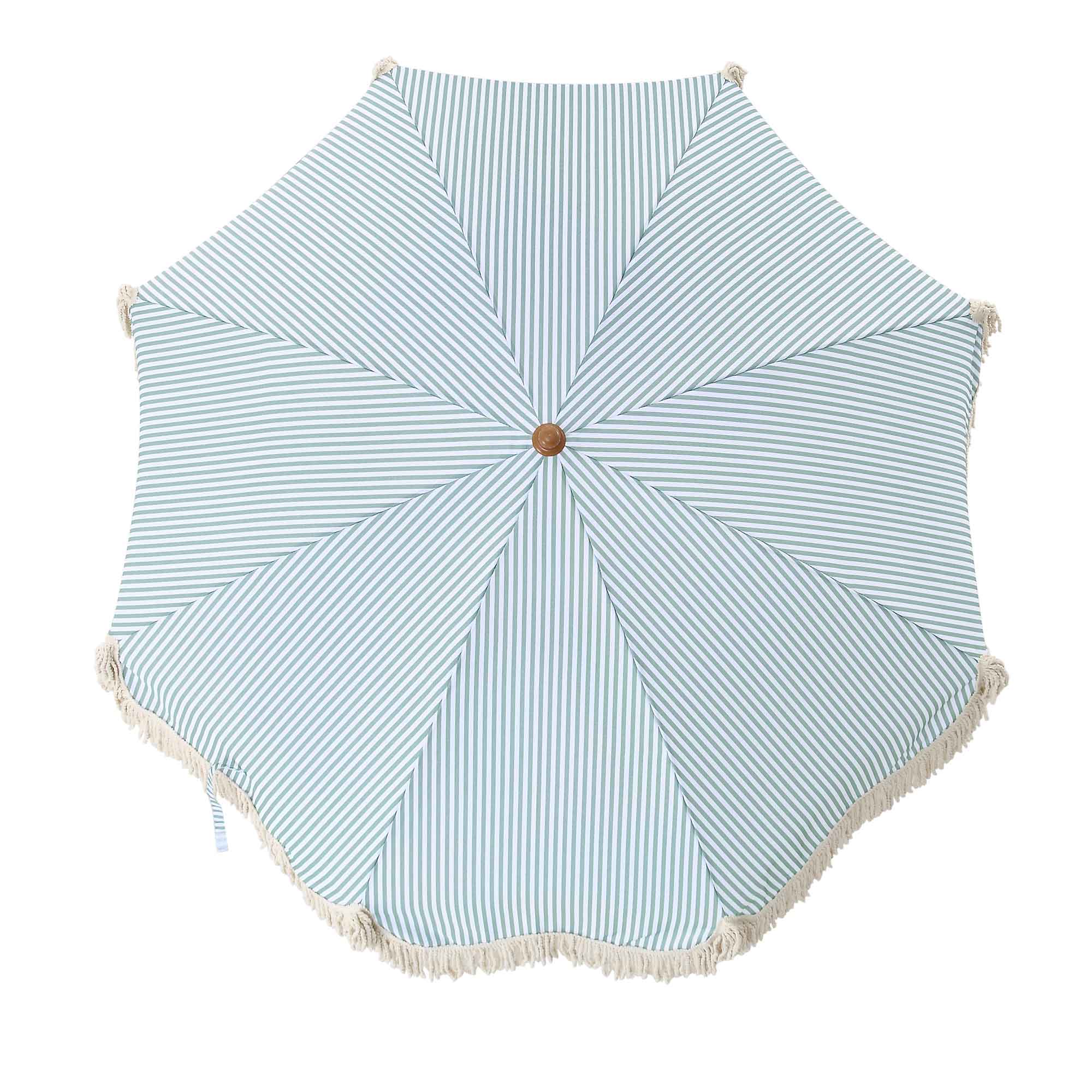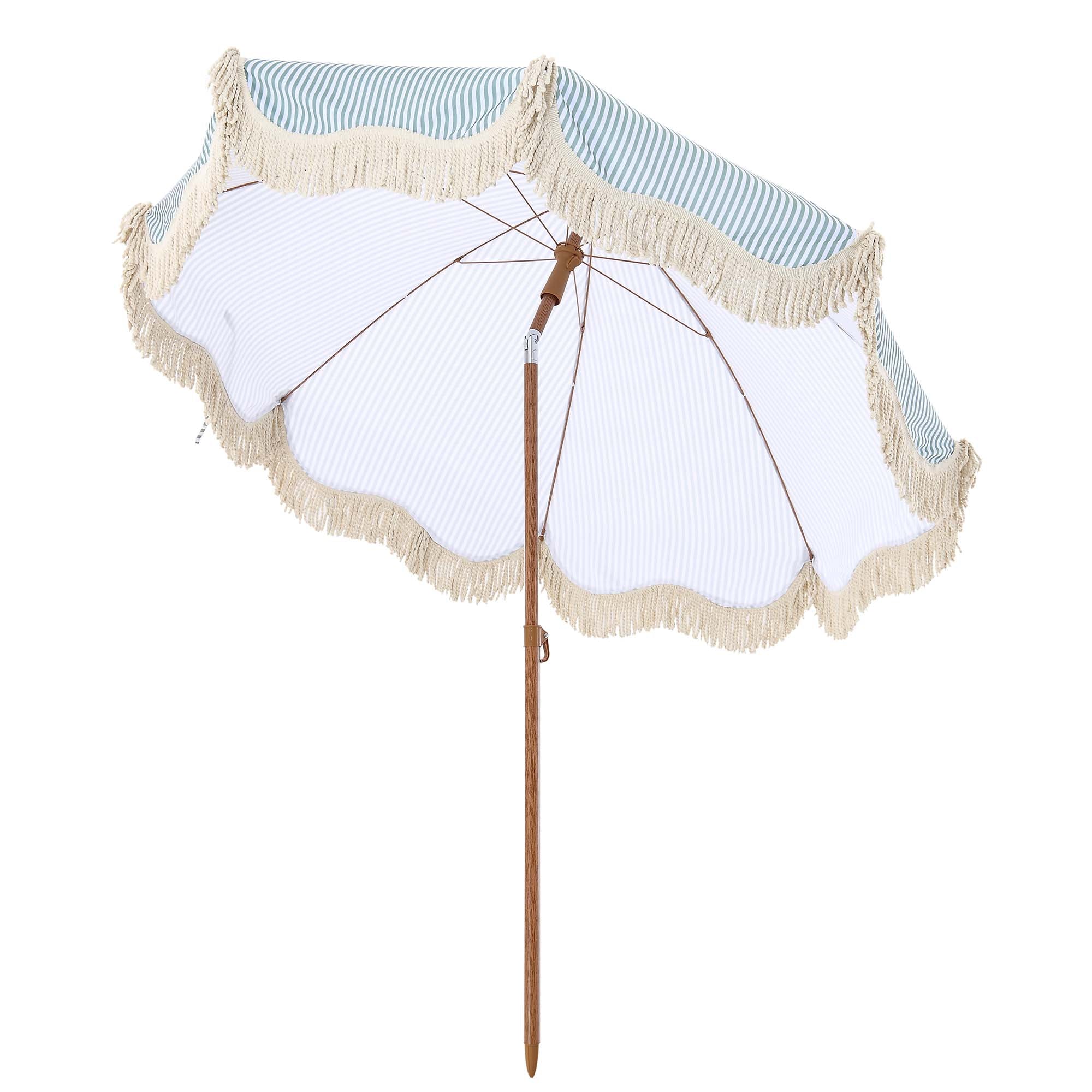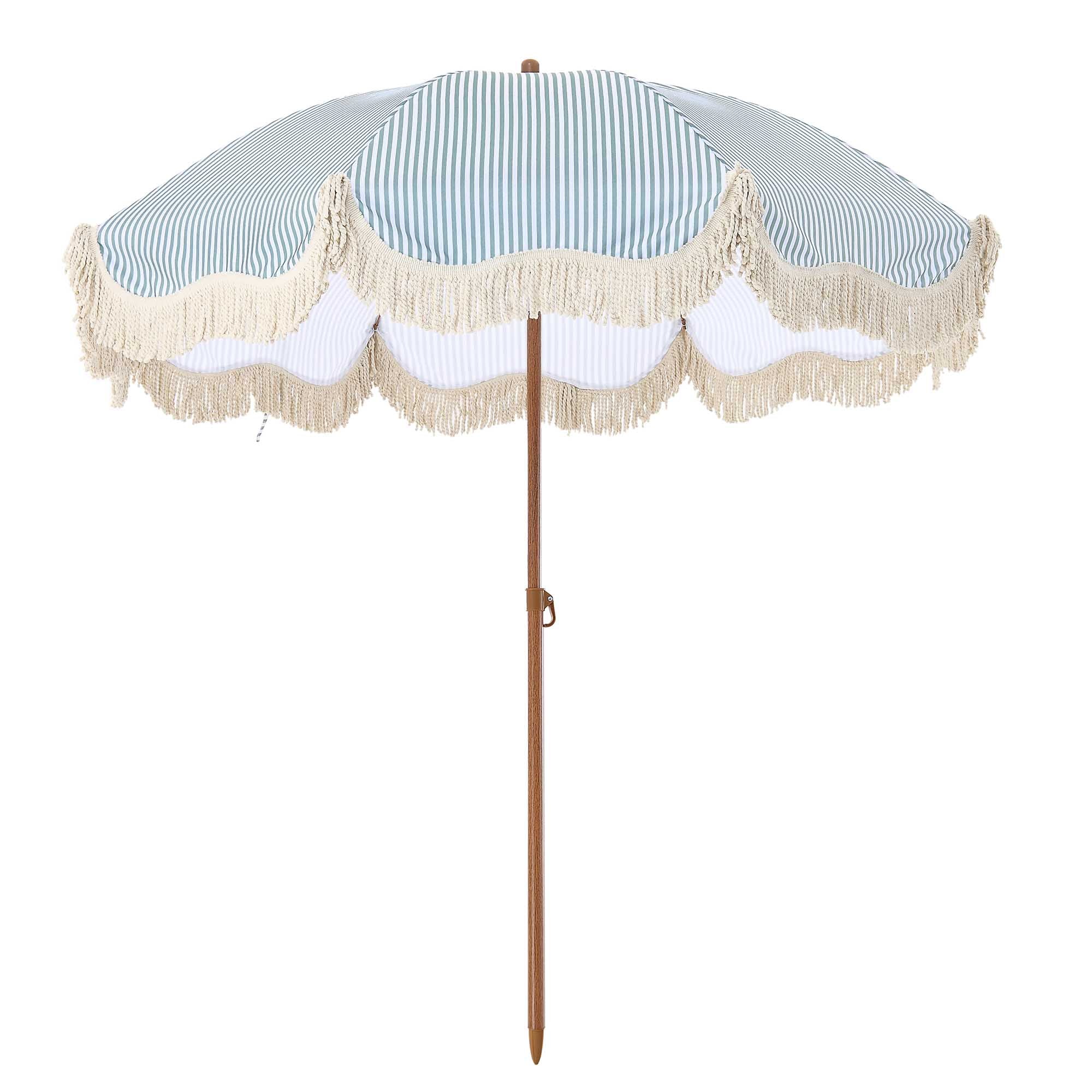 - Featuring chic sage green and white stripe canopy with beige colour fringe, the parasol can tilt by adjustable pole hinge.