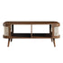 - Hand woven natural rattan coordinates with solid wood legs, with walnut effect finish for a mid-century look.