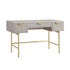 - The dressing table features 3 drawers with a ridged front finished in matte taupe paint, paired with gold handles and legs.