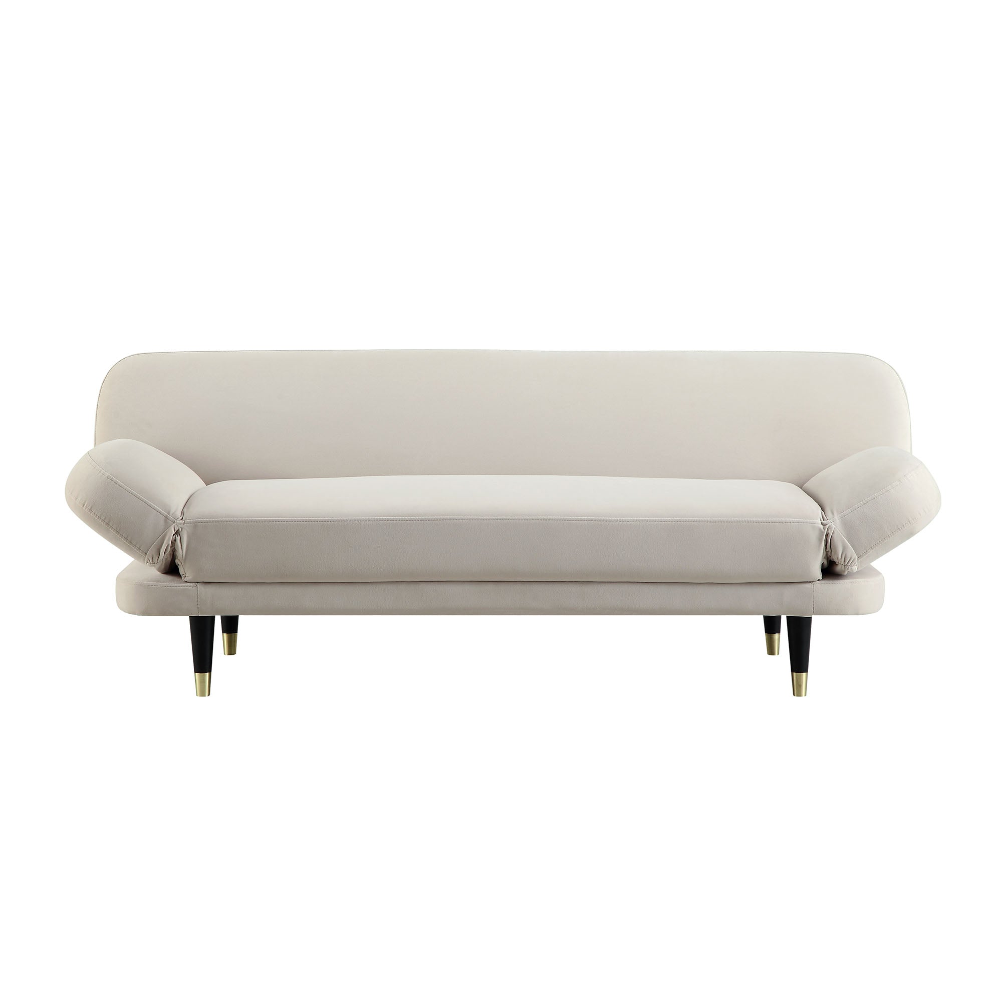 - Upholstered in soft champagne colour velvet, our Solna sofa bed is supported by solid wood internal frame, accented with brass tipped black wooden legs for a mid-century look.