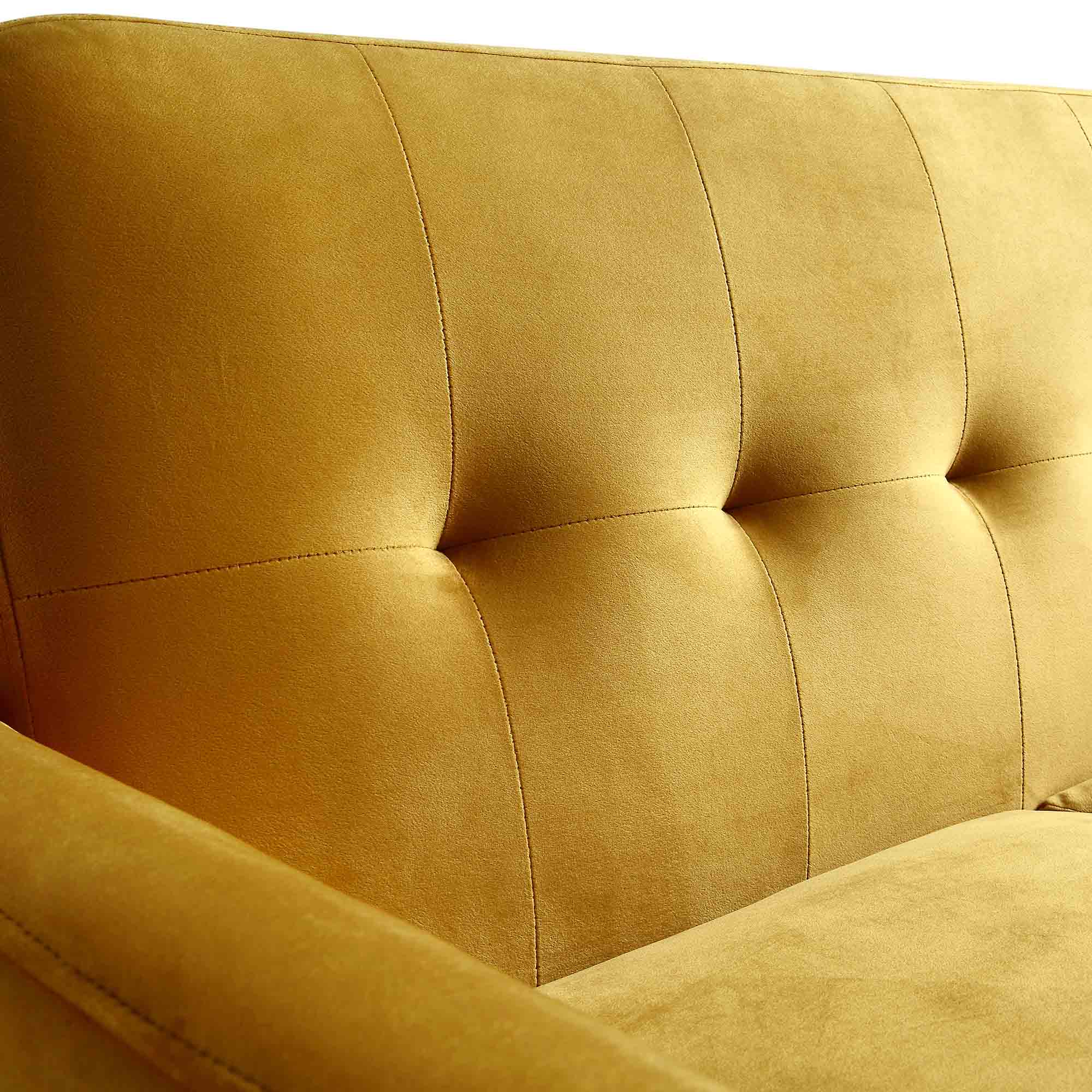 - Upholstered with soft velvet effect fabric in bright mustard yellow colour, the sofa comes with tufted backrest and sits on tapered legs. The well proportioned backrest and thick seat cushions offer a comfortable and supportive sitting experience.