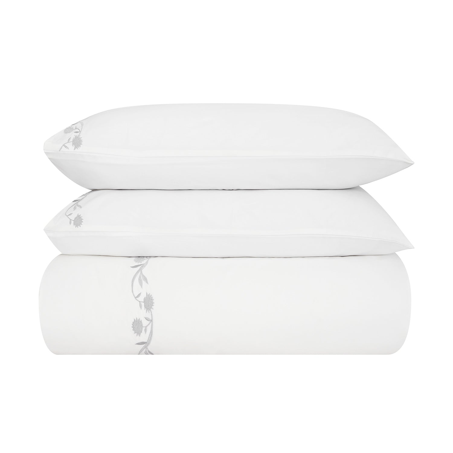 - A delicately embroidered floral vine border gracefully frames the edges of the duvet set. The classic satin grey embroidery adds a touch of lustre and romantic charm, without overpowering the clean, crisp backdrop of pristine white.