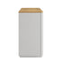 - Curved edges are coordinated with a dove grey matte painted finish and oak top.