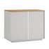 - Curved edges are coordinated with matte dove grey painted finish and solid oak veneer top.