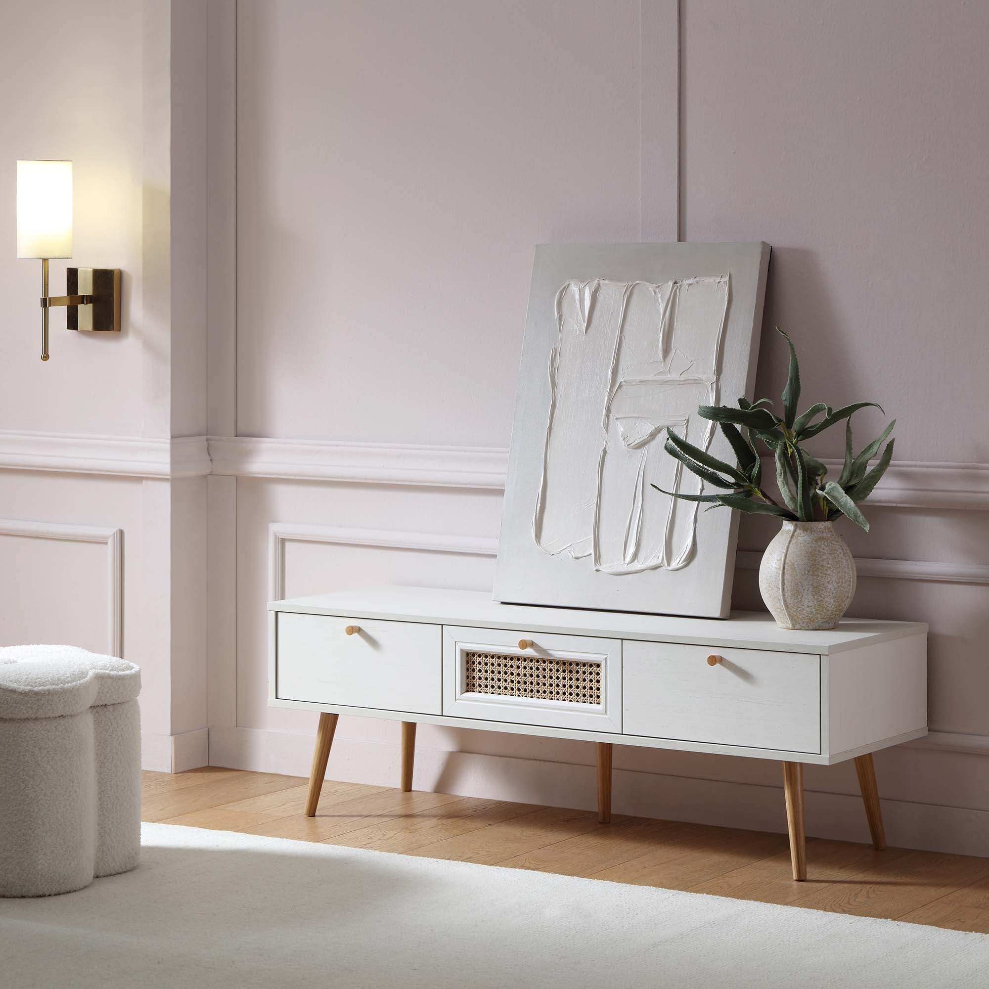 - Our Anya TV unit is characterised by beautiful natural woven rattan drawer front and solid wood drawer handles.