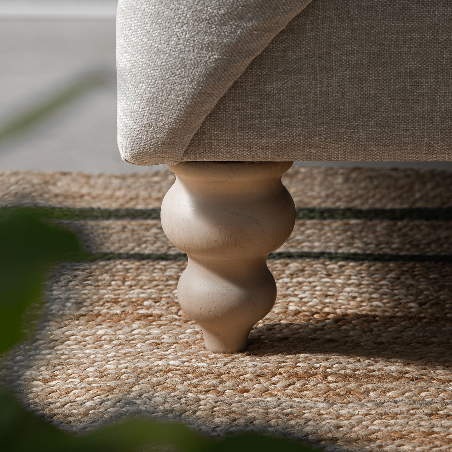 - Slightly distressed turned solid wood legs complement the beautiful neural appeal of the sofa.