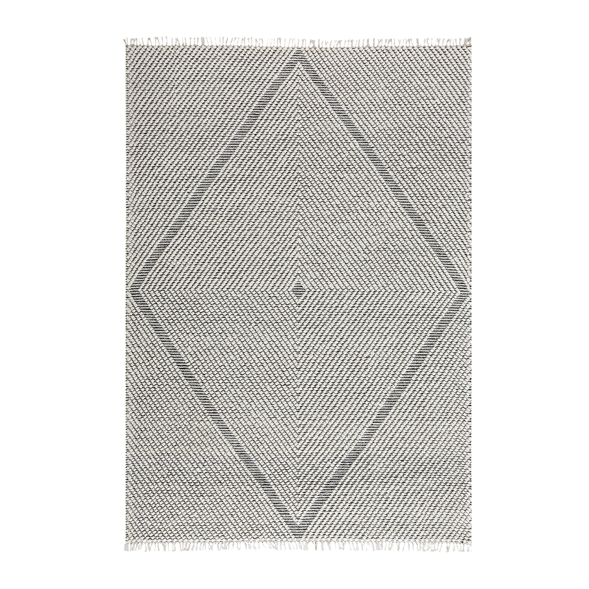 - The Avanti rug features a large monochrome, geometric, diamond design on a salt and pepper look - a combination of black and cream plied wool - which is repeated throughout the rug.
