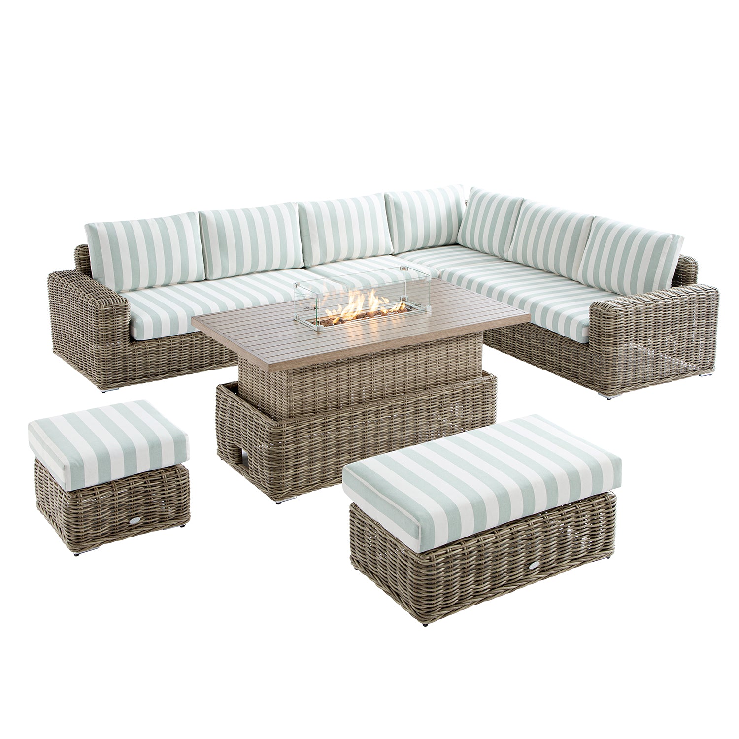 Bellagio Round Wicker Large Corner Casual Dining Set with Rising Firepit Table, Natural with Sage Stripes - daals
