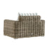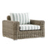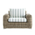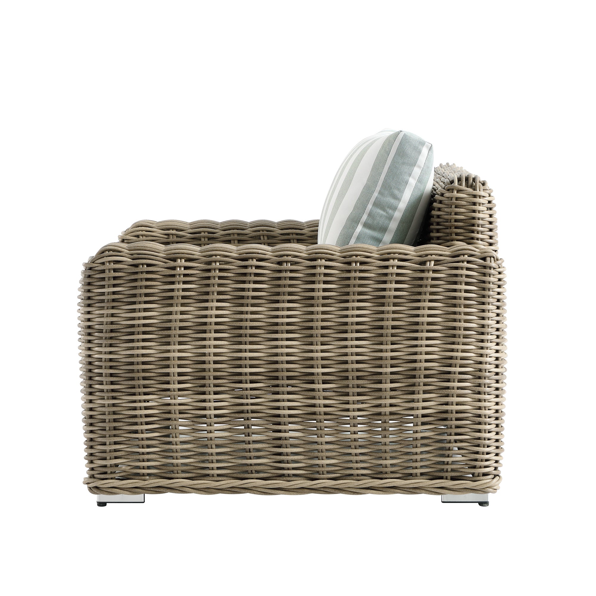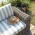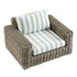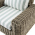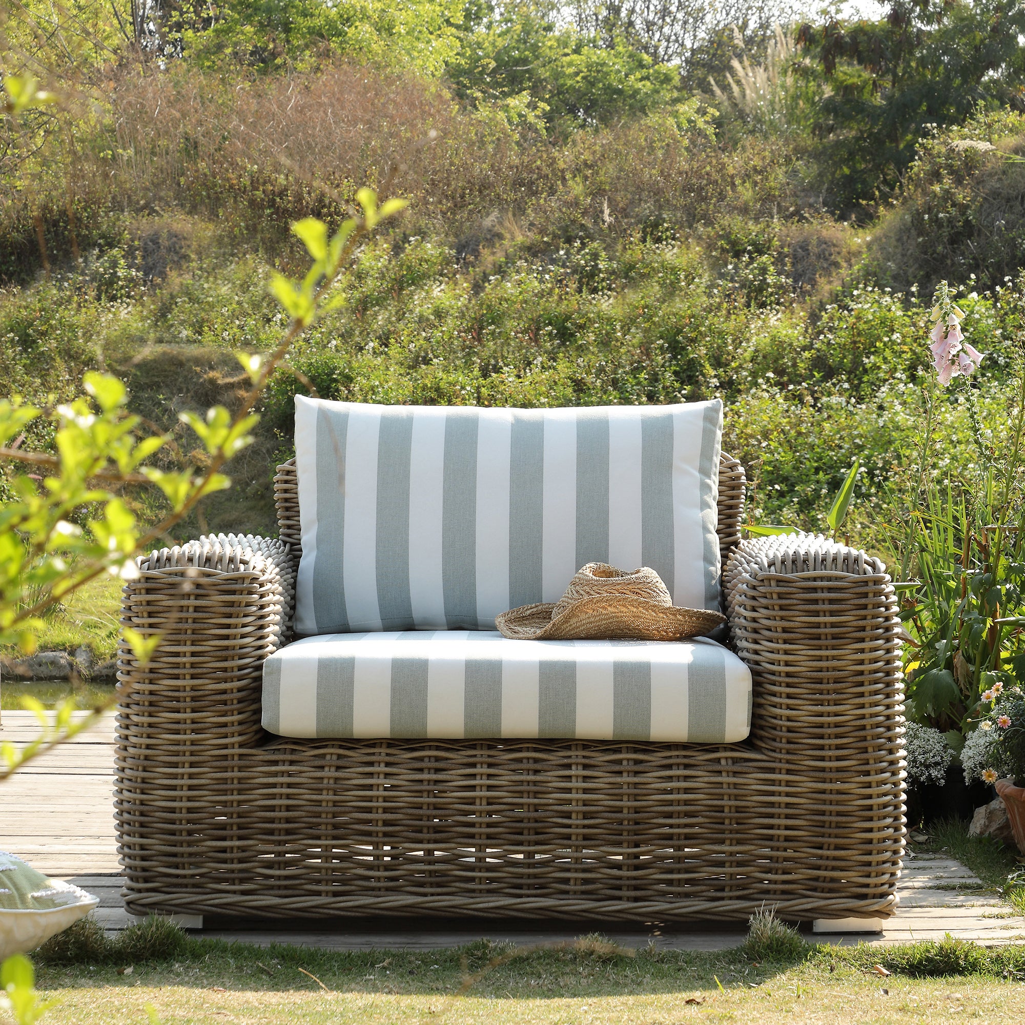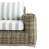 - Fresh sage green striped weatherproof fabric upholstered back and seat cushions perfectly coordinate with the natural colour wicker rattan, creating a focal point in your outdoor space.