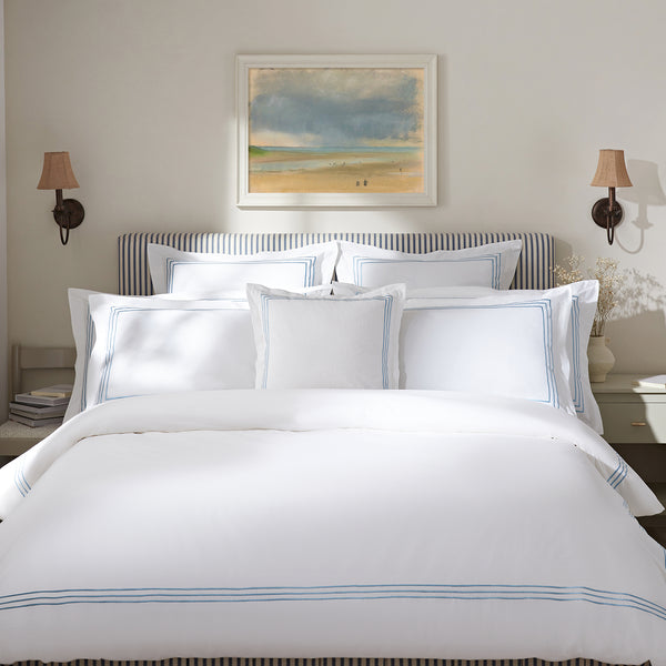 - The duvet set is a crisp white and features a sleek and sophisticated triple line embroidered border in a rich royal blue satin stitch for a tailored finish, striking the perfect balance between classic and contemporary. The subtle hints of royal blue create a feeling of serenity and tranquility, while the neutral colour palette allows the bedding to work with a variety of bedroom decor themes.