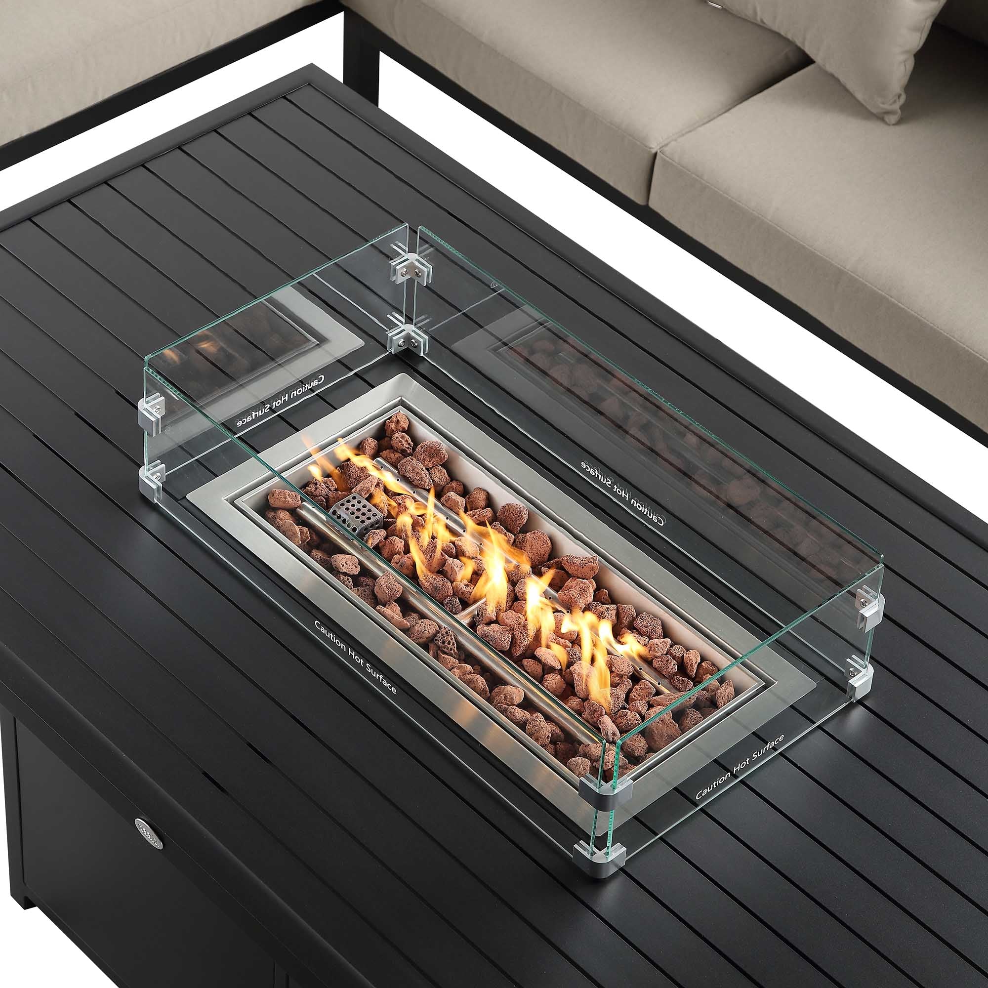Calabasas Large Outdoor Fabric and Aluminium Corner Casual Dining Set with Firepit Table, Taupe
