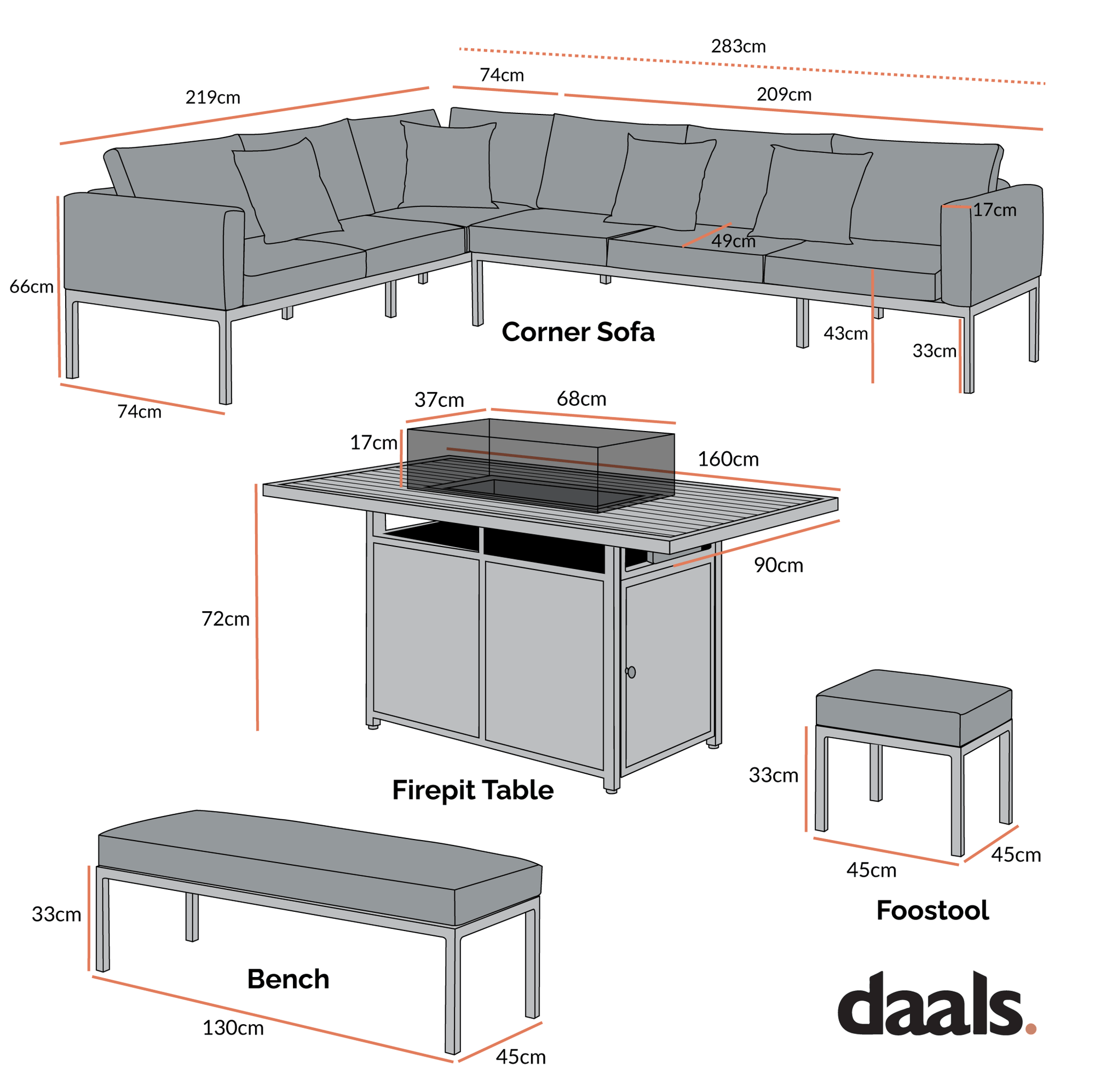 - Comprising of a solid aluminium frame and sumptuous back and seat cushions for added comfort and support, our Calabasas Large Outdoor Fabric and Aluminium Corner Casual Dining Set is perfect for outdoor gatherings