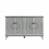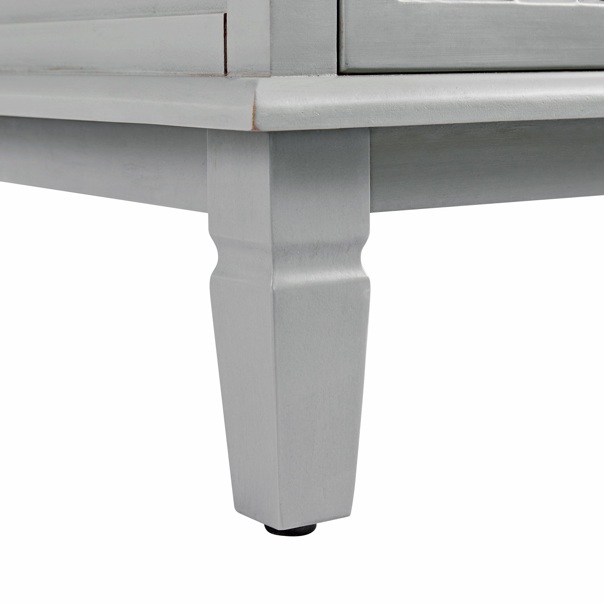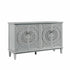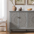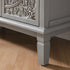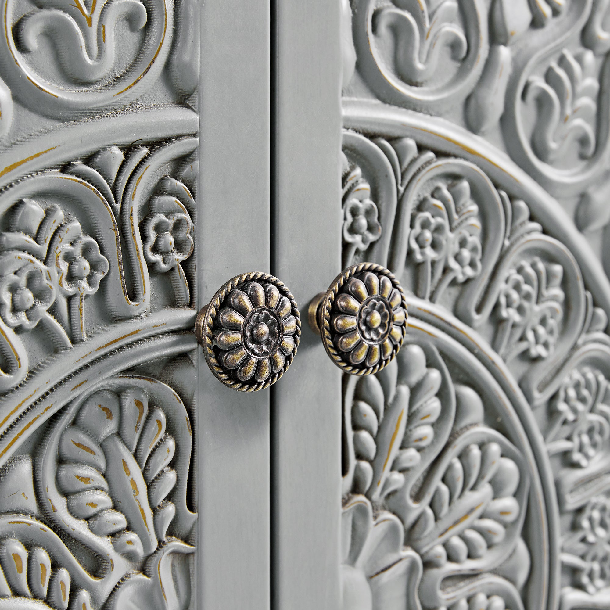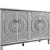 - The sideboard doors are adorned with intricate floral carvings, enhanced by subtle distressed finish.