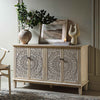 - Our Chantilly large sideboard features whitewashed finish wooden surfaces with beautiful carved drawer fronts.