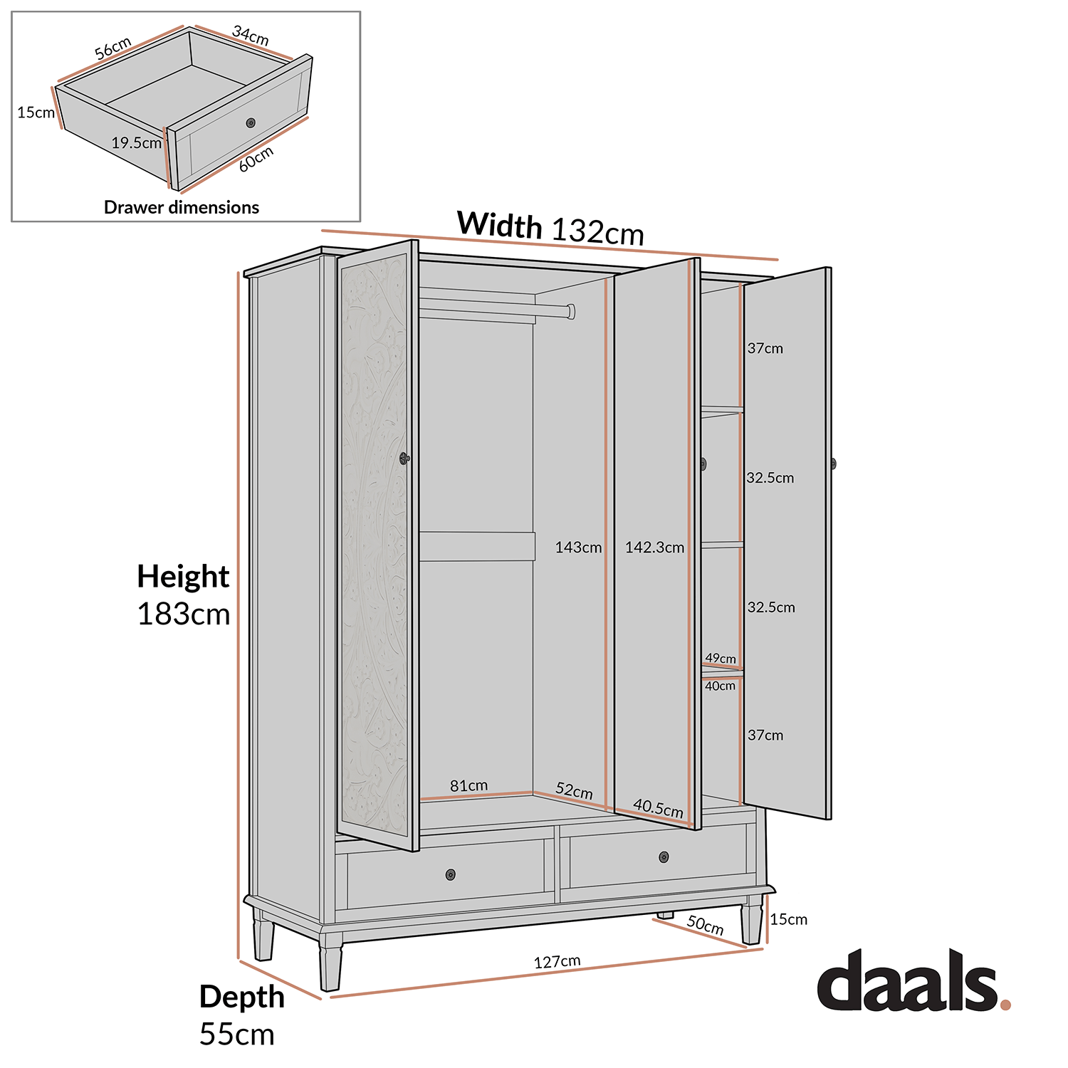 - Bottom drawers internal size: W 56.0 x D 34.0 x H 15.0 cm