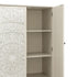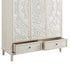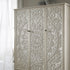 - The carved doors are paired with flower patterned antique brass handles for a boho chic look.