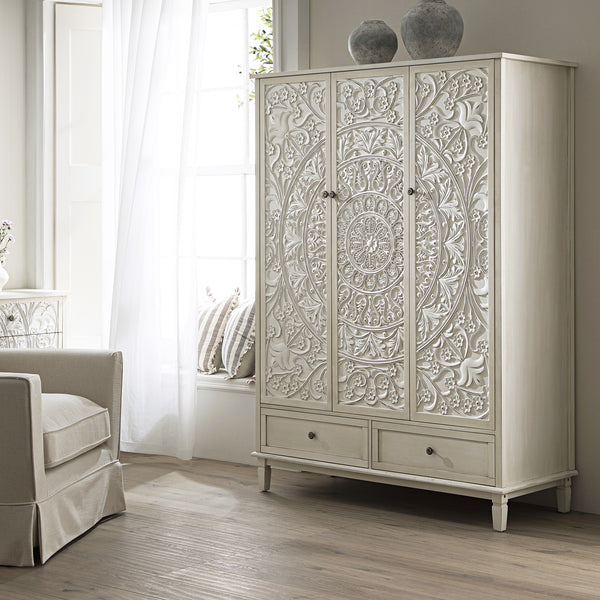 - Out Chantilly triple wardrobe offers plenty of storage space inside its useful drawers and beautifully carved doors, finished with whitewashed paint without covering any natural wooden grain.