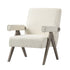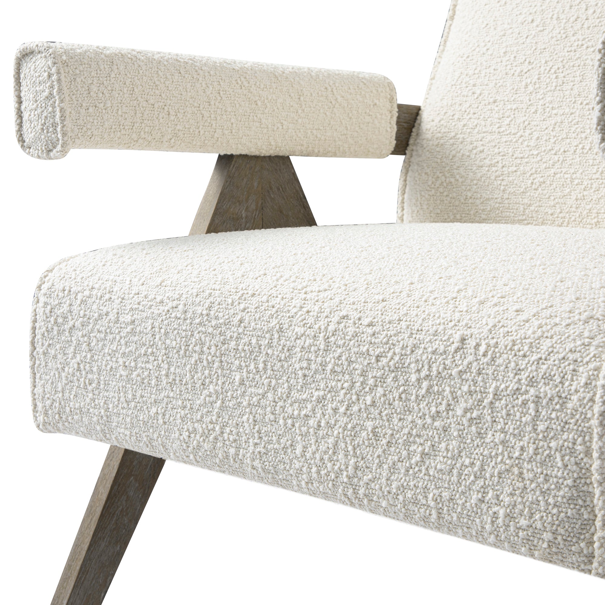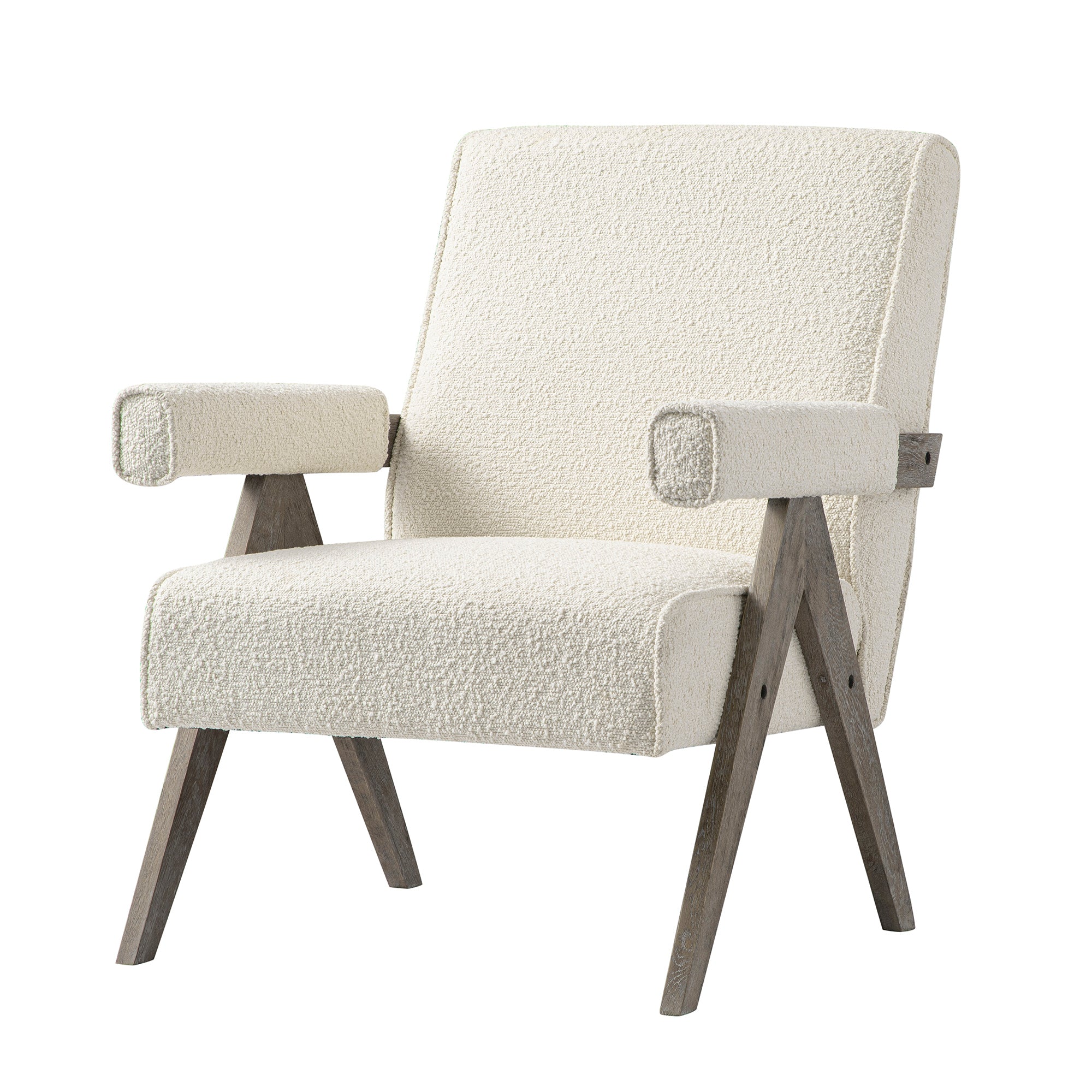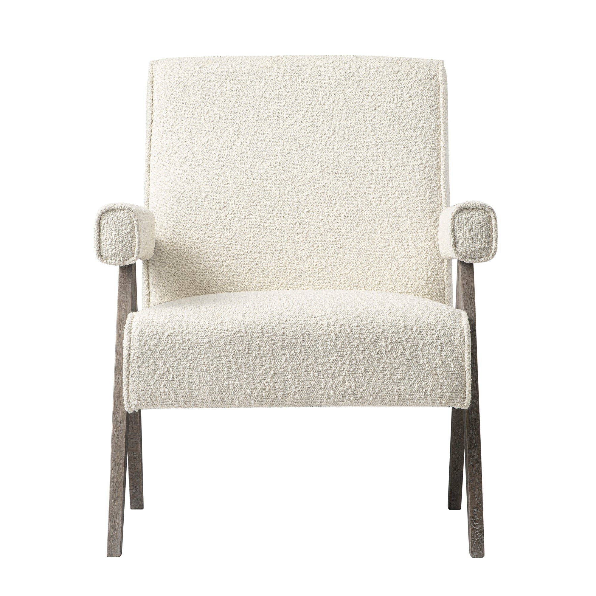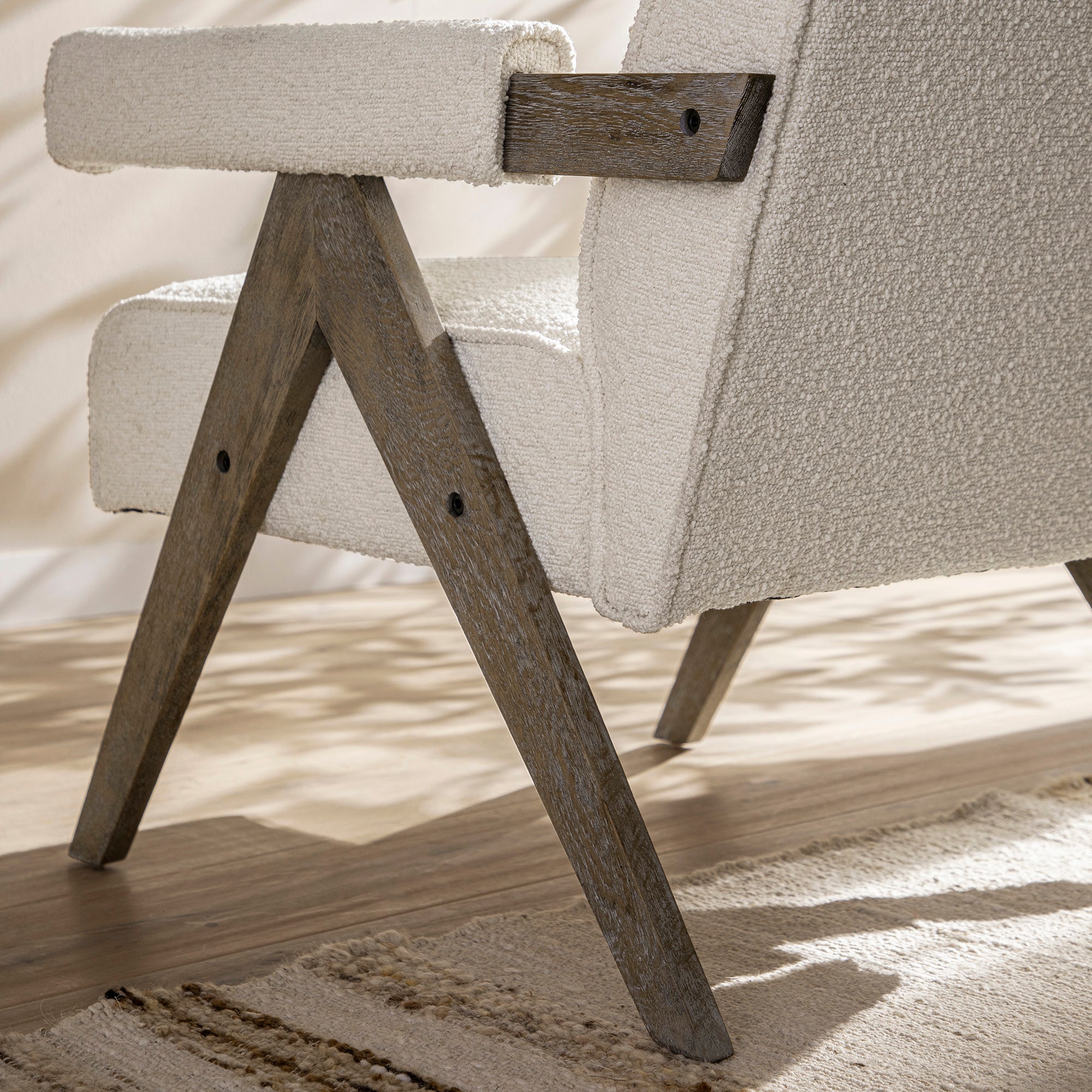 - Well-cushioned in seat, back and arm and upholstered in beautiful textured beige boucle fabric, the chair is finished with solid oak frame with weathered finish.