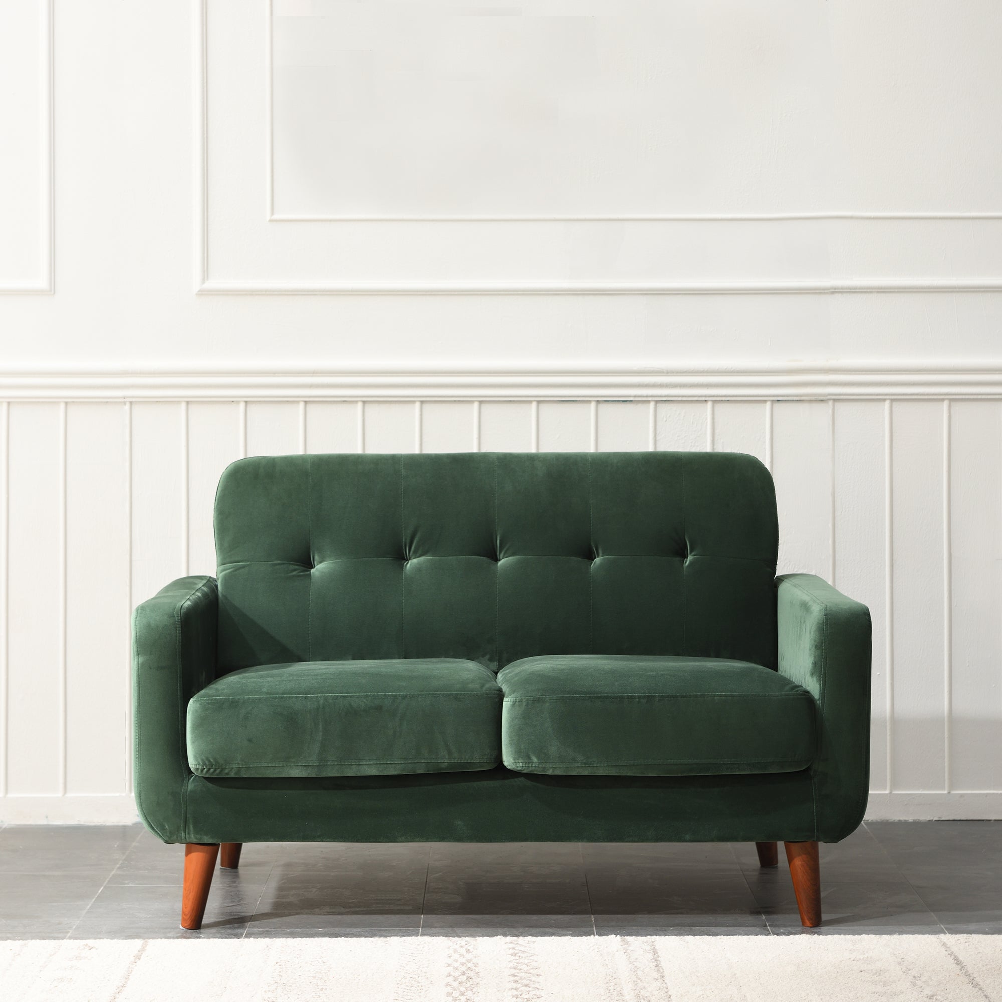 • Upholstered with soft velvet effect fabric in beautiful colours, the sofa comes with tufted backrest and sits on tapered legs. The well proportioned backrest and thick seat cushions offer a comfortable and supportive sitting experience.