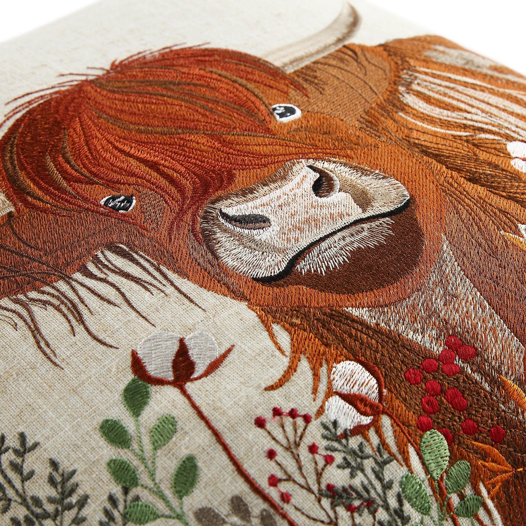 - We just love the outstanding attention to detail of this cushion, featuring a strikingly beautiful highland cow amongst country foliage.