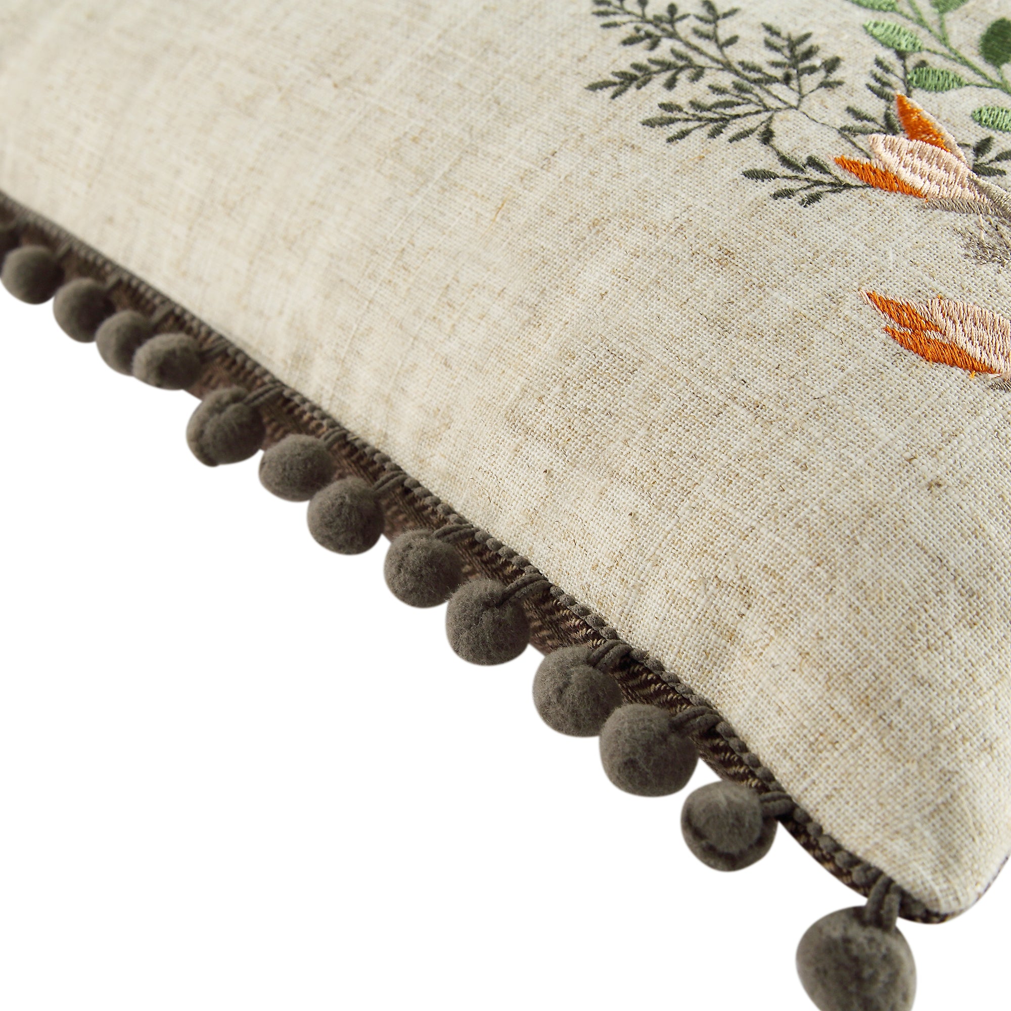 - The Linen blend base has been intricately embroidered, the edges have been finished off with a grey pompom trim and the contrast of the brown herringbone reverse really adds to the country feel.