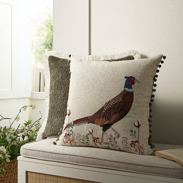 - Complete the look: Pictured with our Country Collection Pheasant Embroidered Cushion is our Frances Woven Rattan Double Storage Stool with Cushion in White, and our Kyra Stone Bouclé Fringed Cushion.