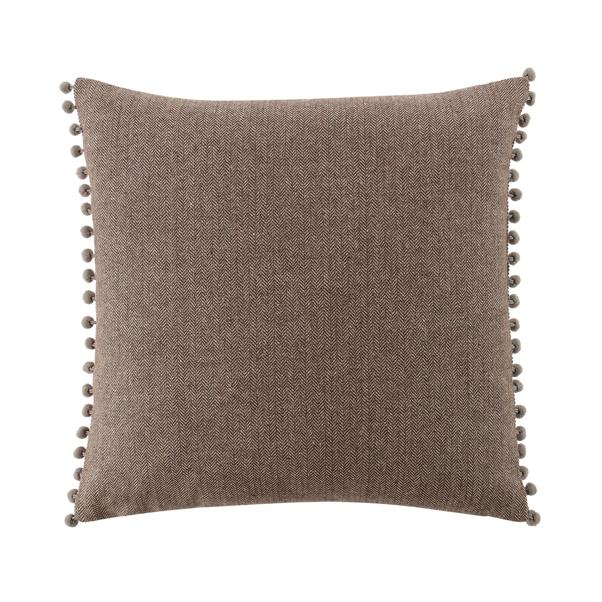 - The linen blend base has been intricately embroidered, the edges have been finished off with a grey pompom trim and the contrast of the brown herringbone reverse really adds to the country feel.