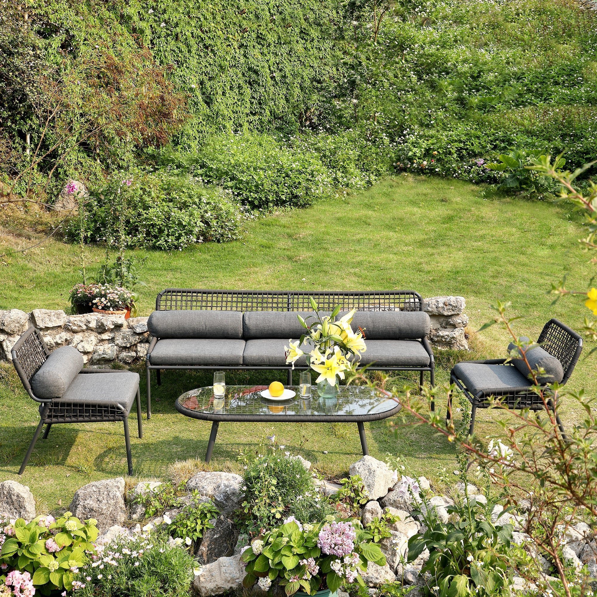 - Pomona Rope Weave 5-Seater Sofa Set, Dark Grey Fabric with Black Frame