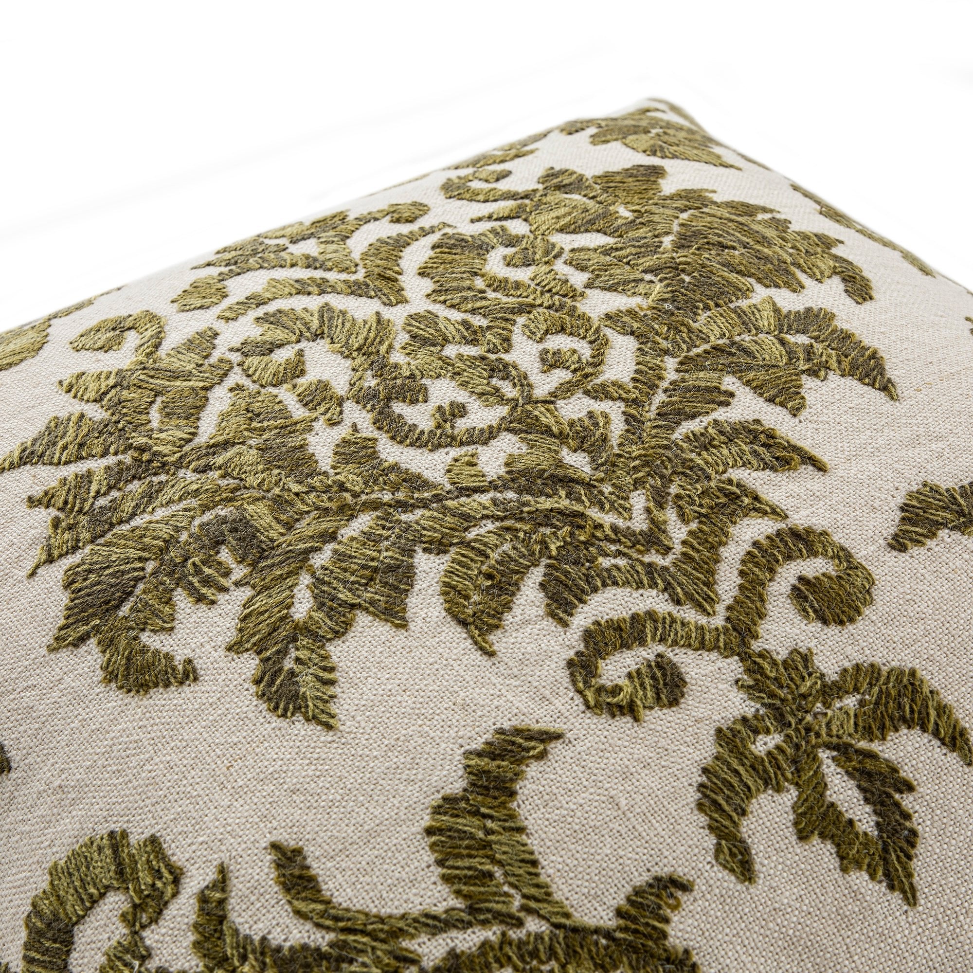 - Our Damask moss green cushion is uniquely designed by daals and is handmade in India using the finest materials and embroidery techniques.