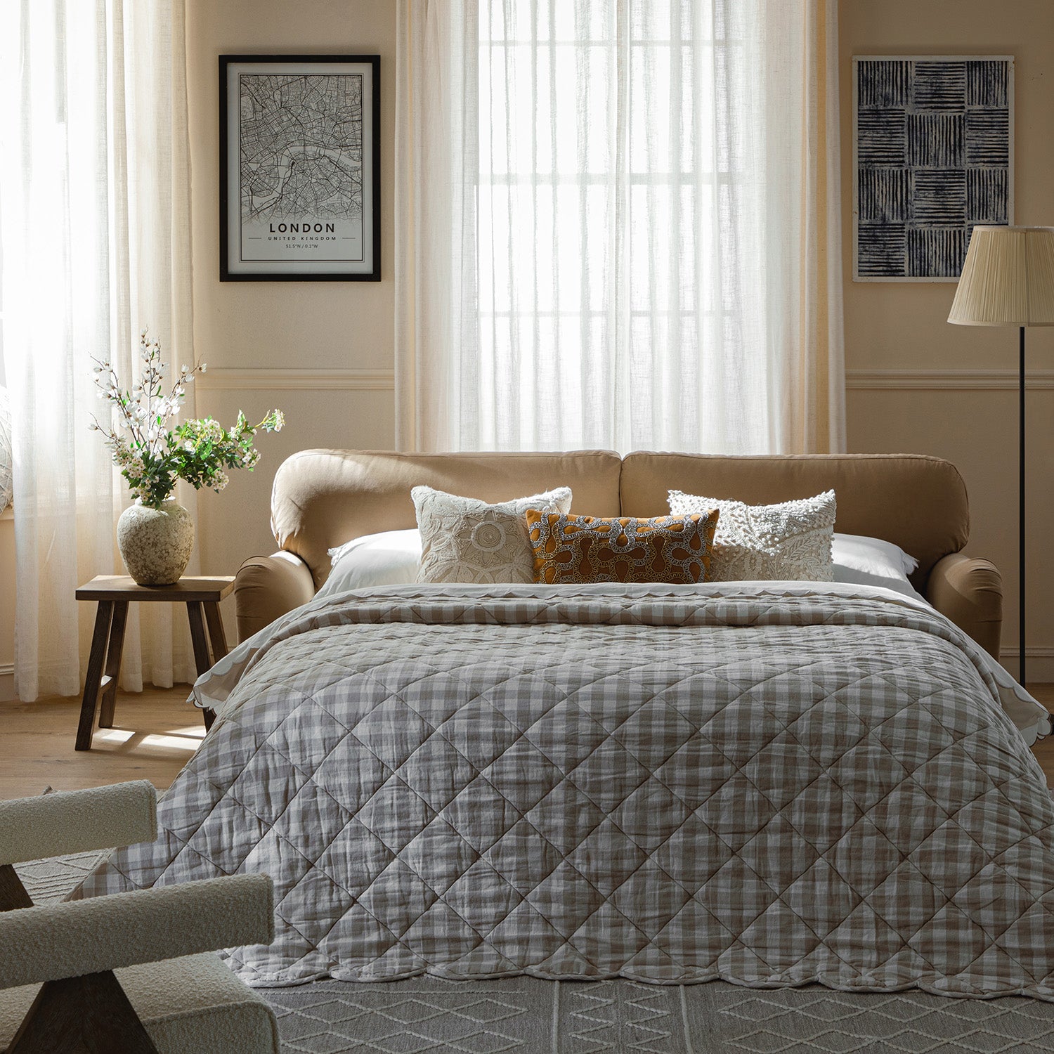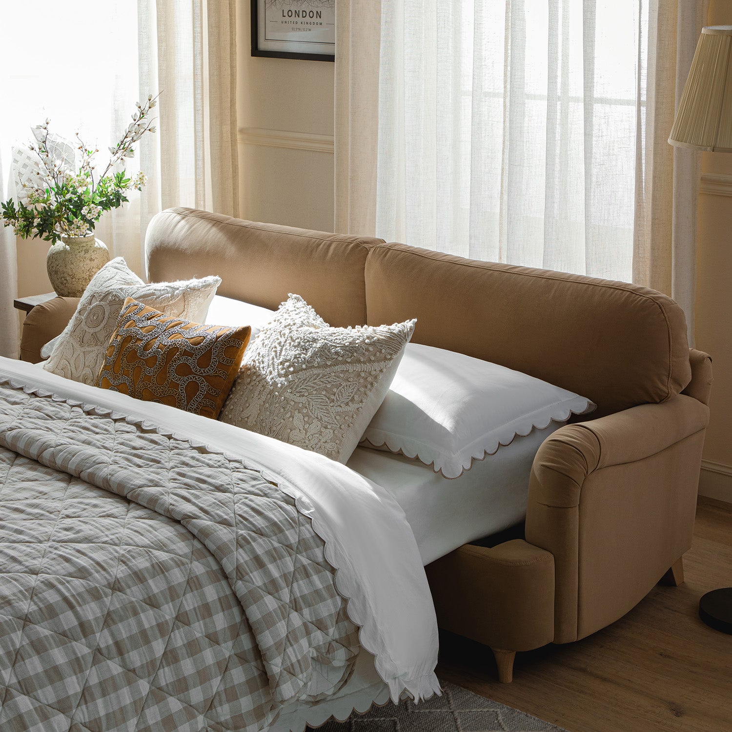 Complete the look: Pictured with the Daphnis Camel Velvet Sofa Bed is our Matilda Beige Gingham Scallop Quilted Bedspread, Margot Taupe Embroidered Scallop Duvet Set, Maison Neutral Rosanna Cushion, Luxe Orla Hand Beaded Apricot Cotton Velvet Cushion, Maison Neutral Josie Embroidered French Knot Cushion, Nyla Aztec Handwoven Steel Grey Rug, Maru Black Chest of 3 Drawers and Chinnor Beige Boucle Accent Chair.
