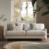 - Complete the look: Pictured with our Daphnis Oatmeal Fabric 3-Seater Sofa is our Evie Hand braided Jute Scalloped Round Rug, our Luxe Collection Odilla Sparkle Cord Cushion, Indigo Collection Laguna French Knot Cushion and our Meadow Hand Beaded Sage Green Cushion
