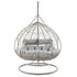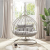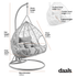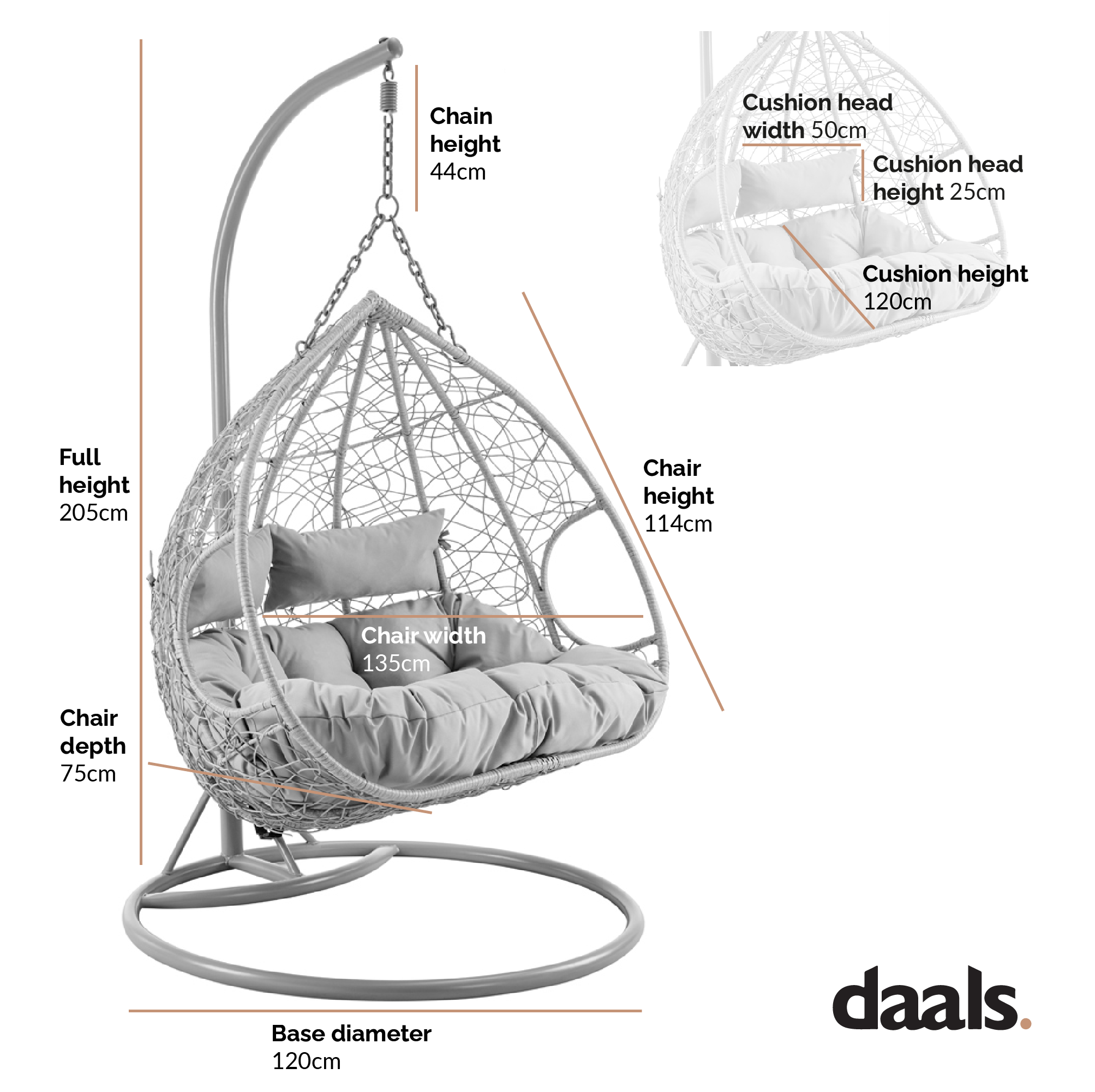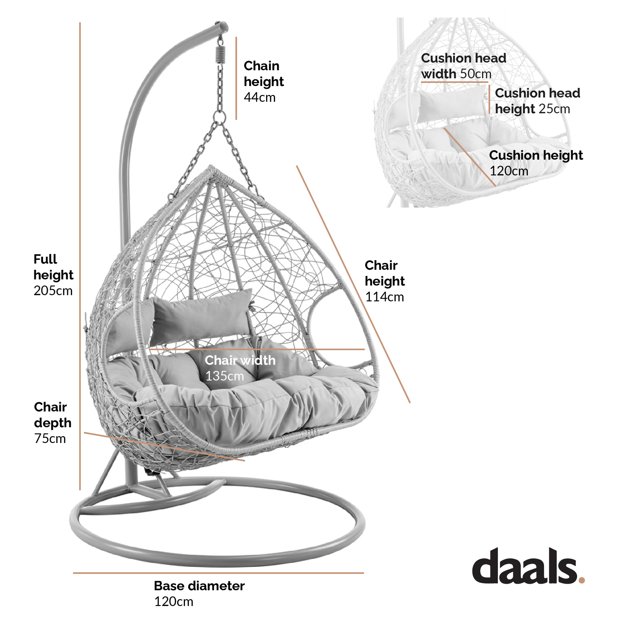 - Our Deneb hanging chair is made with durable hand woven light grey faux rattan, matched with comfortable grey cushions.