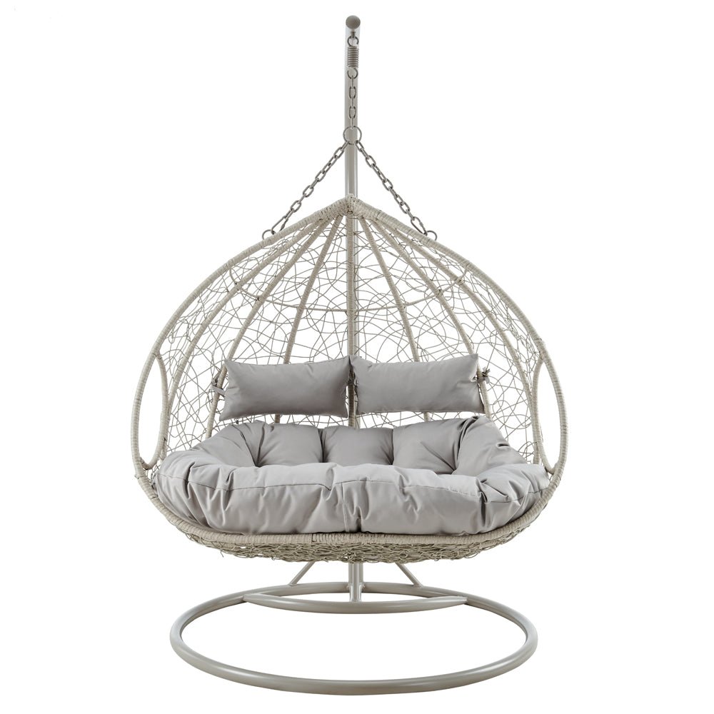 - The hanging chair includes sumptuously filled cushion upholstered in beige colour weatherproof UV resistant fabric.