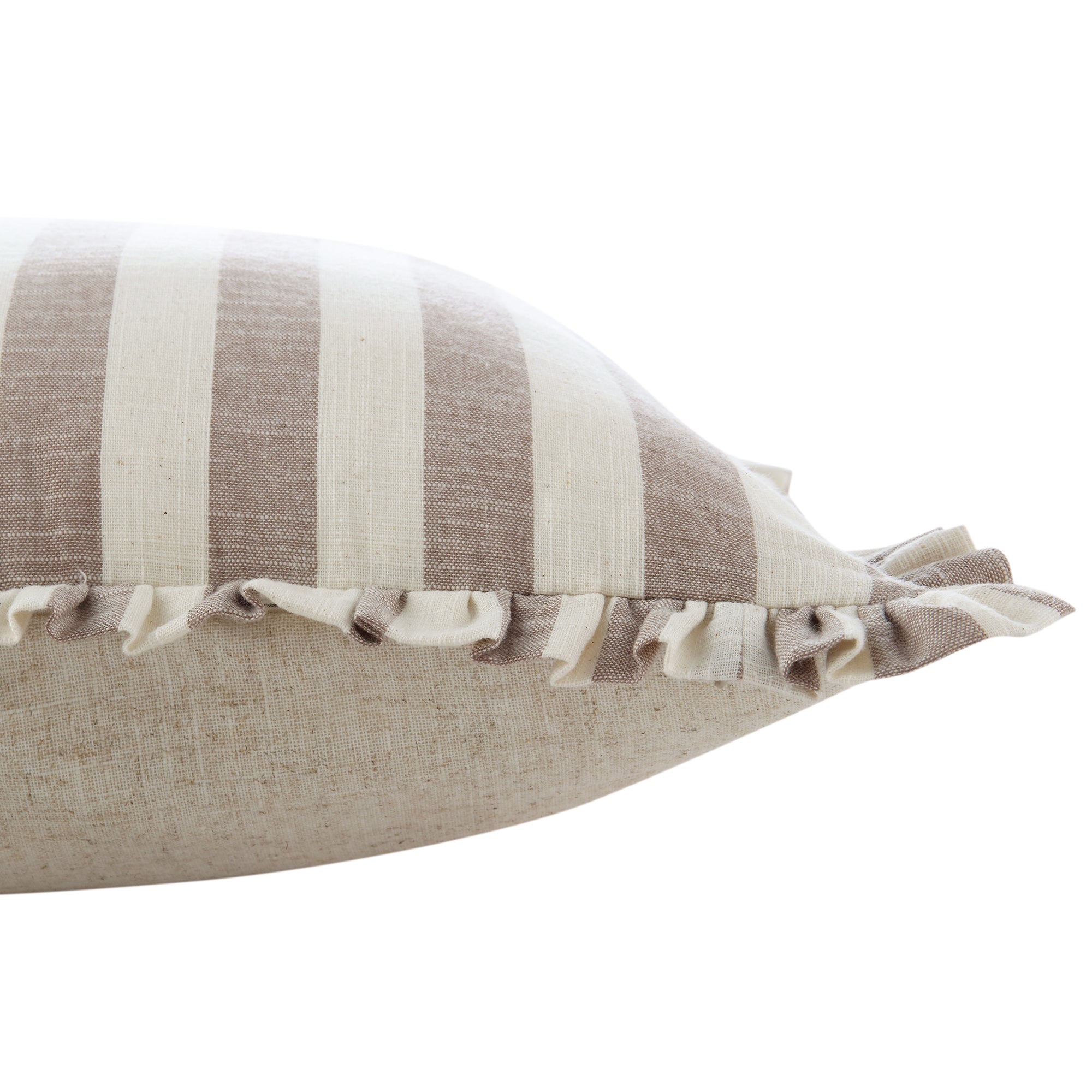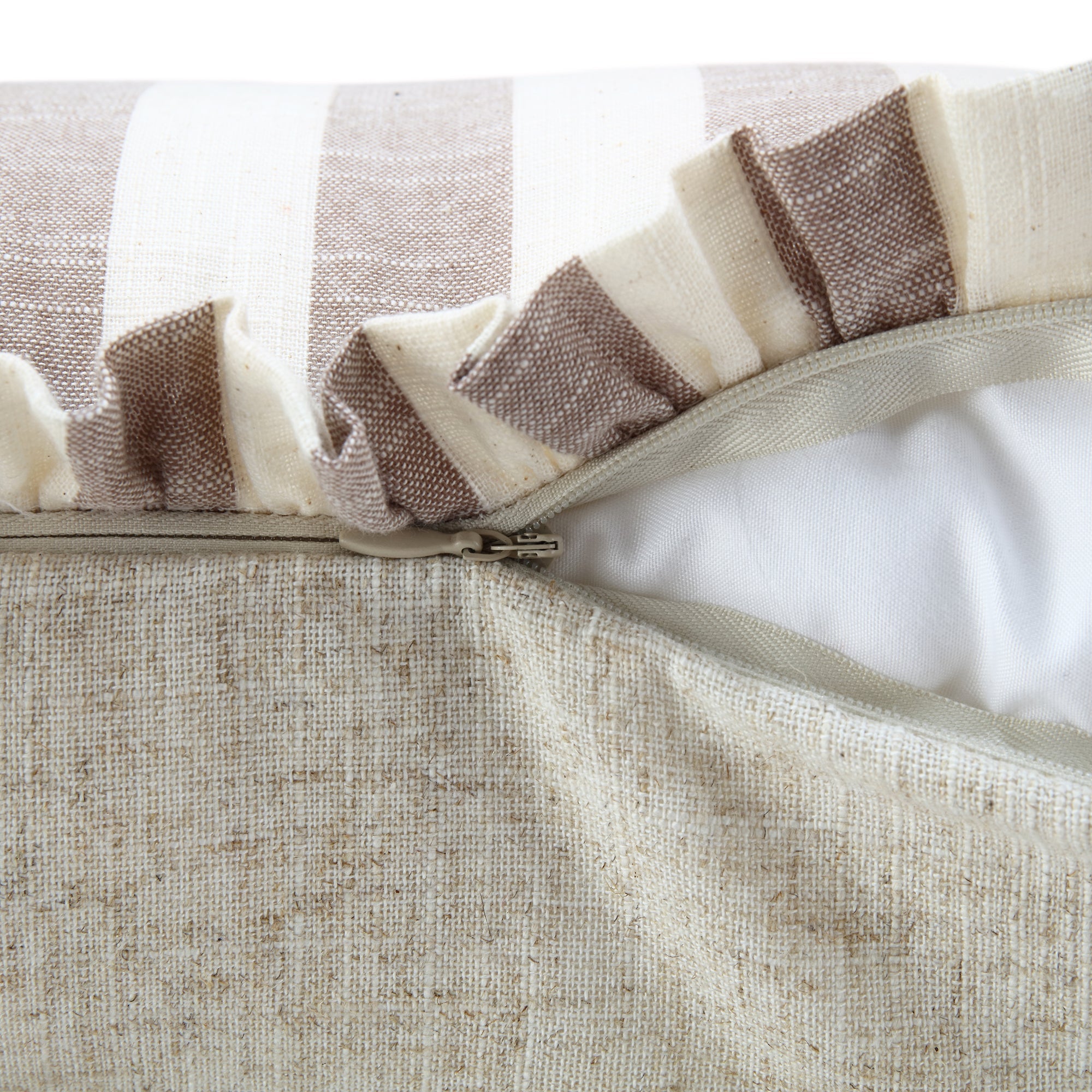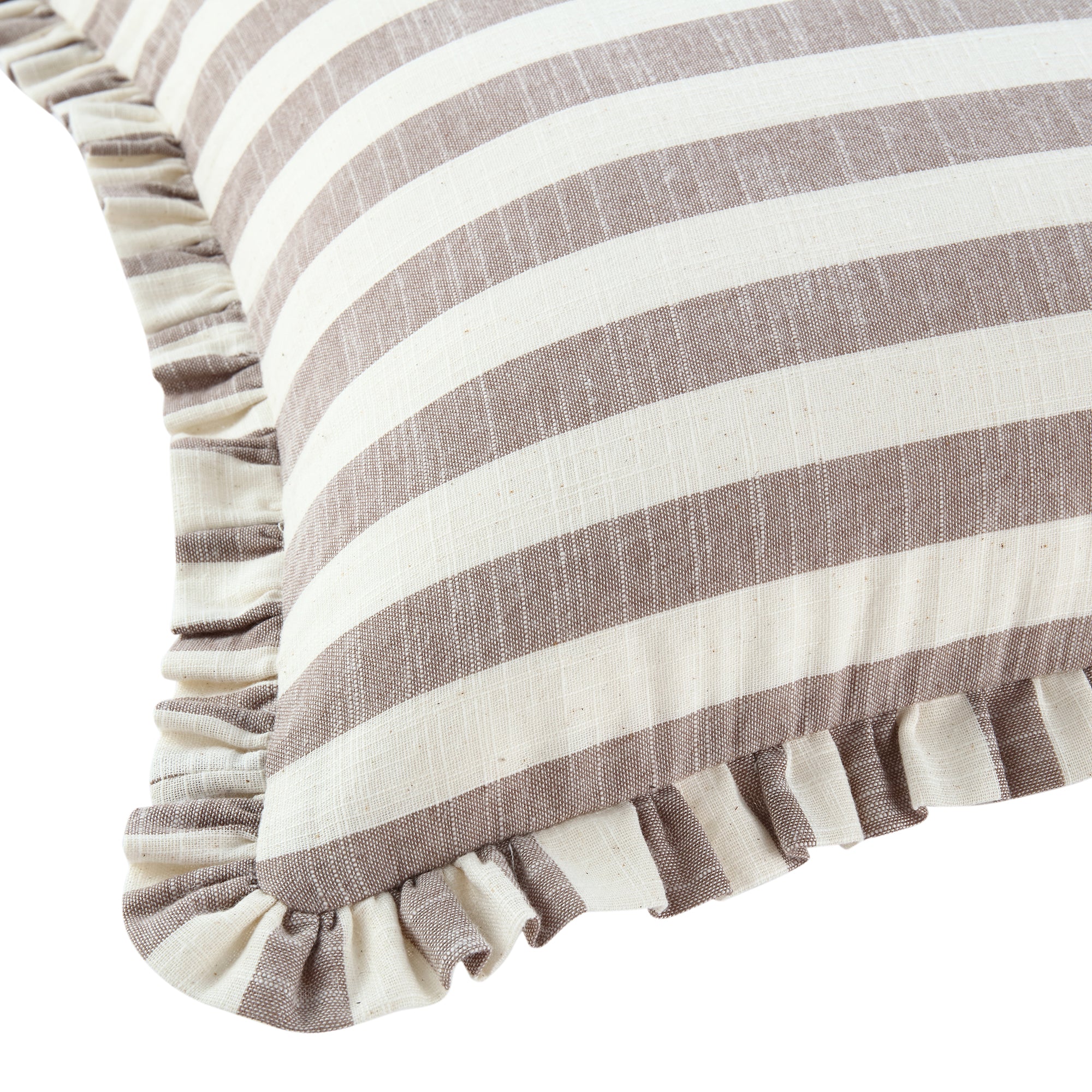 - One side features a beige striped design with a ruffled beige stripe edge.