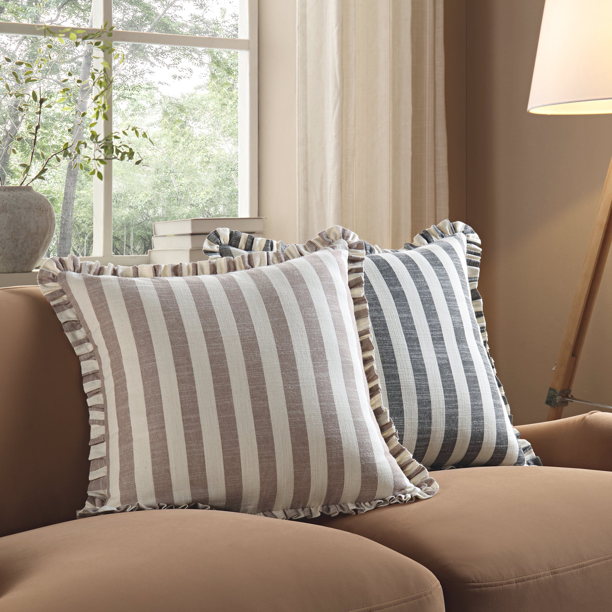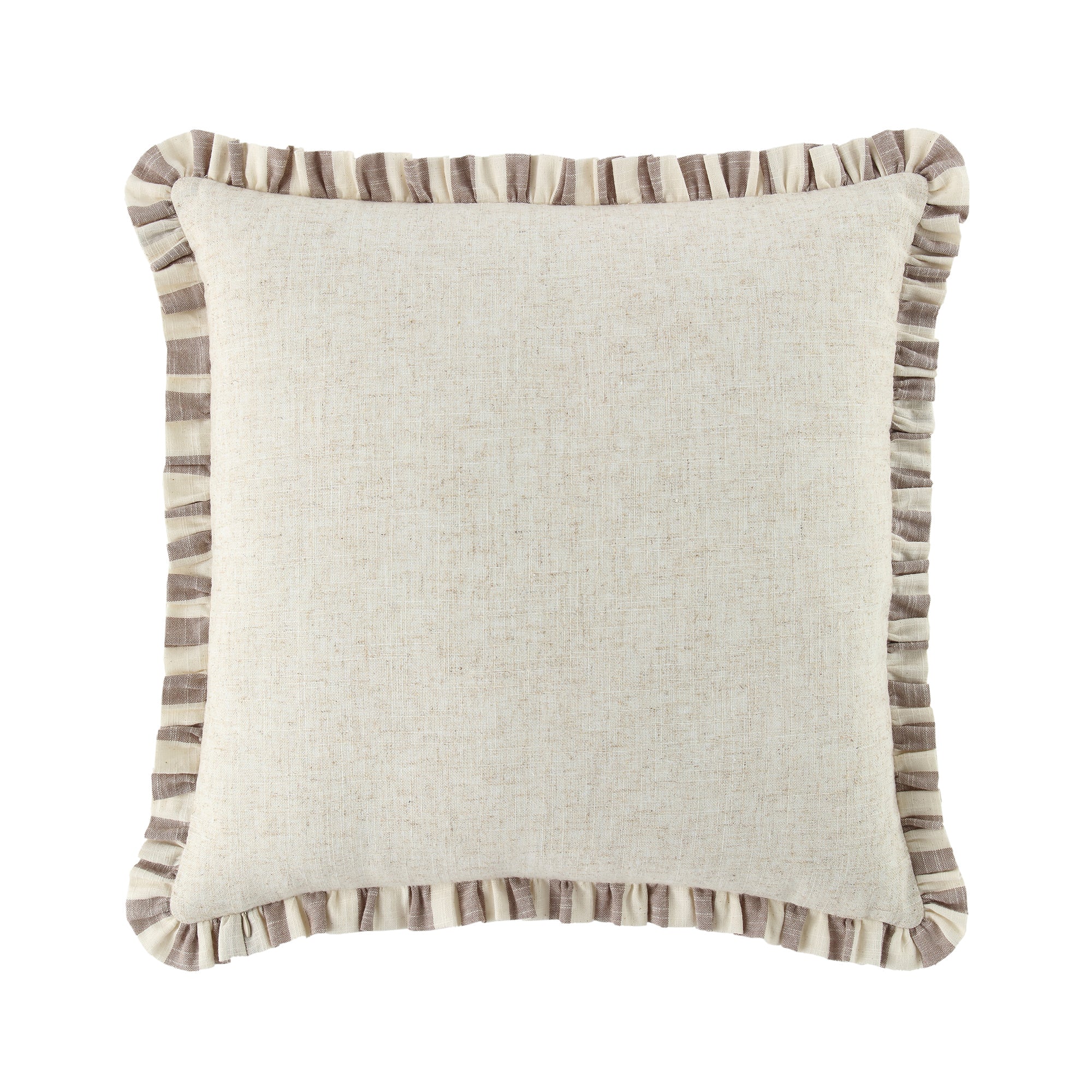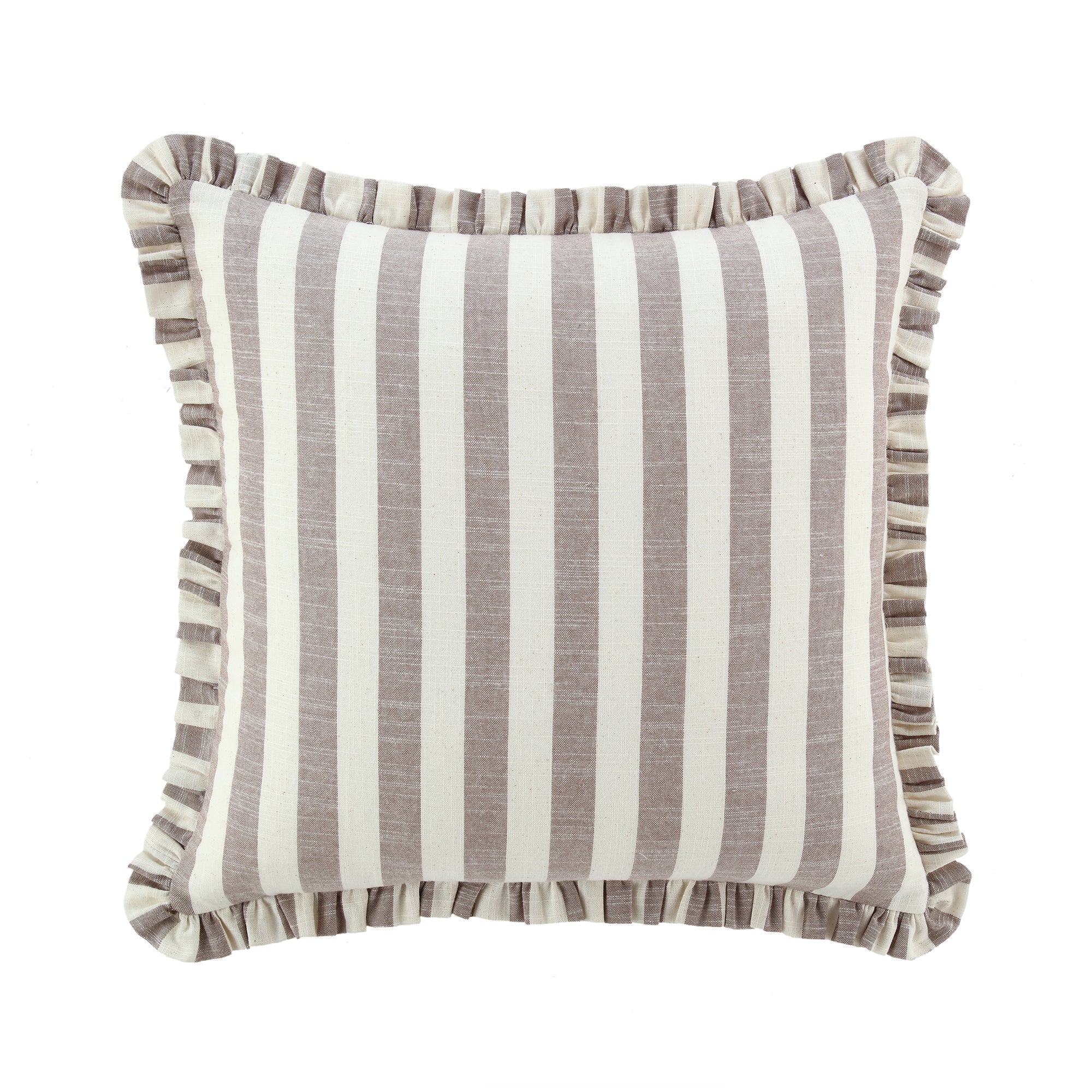 - One side features a beige striped design with a ruffled beige stripe edge.