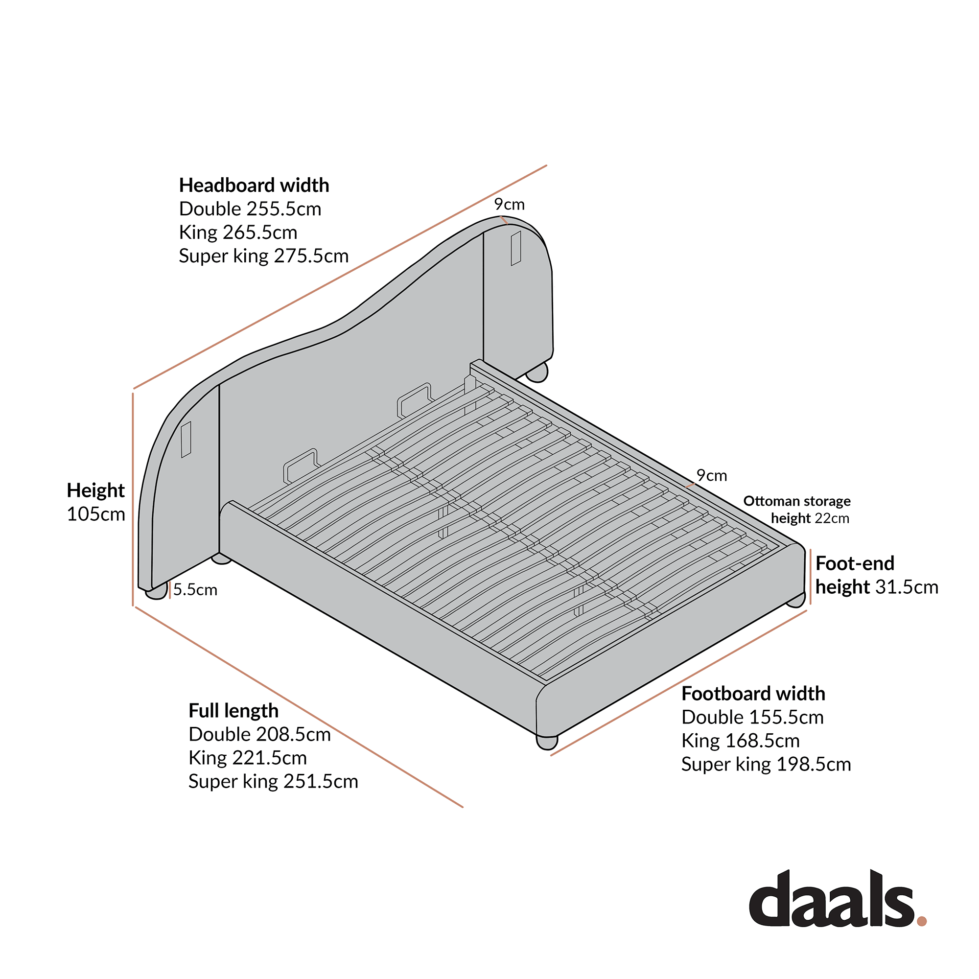 - 6FT Super King: W 275.5 x D 251.5 x H 105.0 cm
