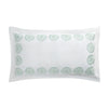 - Intricately embroidered circular floral motifs in stunning seafoam green adorn the borders of the Elodie pillowcases, exuding elegance and opulence. The seafoam green tone feels refreshing and stands out against the crisp white base.