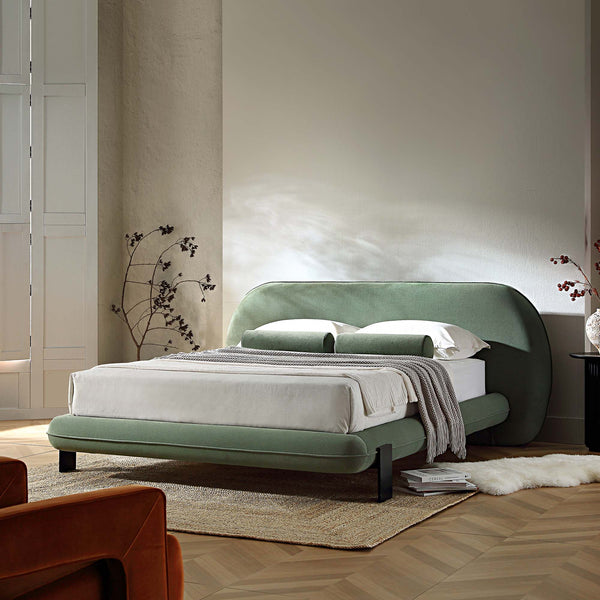 - The bed is beautifully upholstered in olive green fabric, accented with handcrafted piping details along the perimeter.