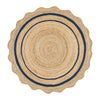 - Evie’s design incorporates a subtle spiral appearance towards the centre of the rug. This is then complemented by the classic scalloped edge and a deep navy blue double border to add contrast to the natural jute.