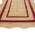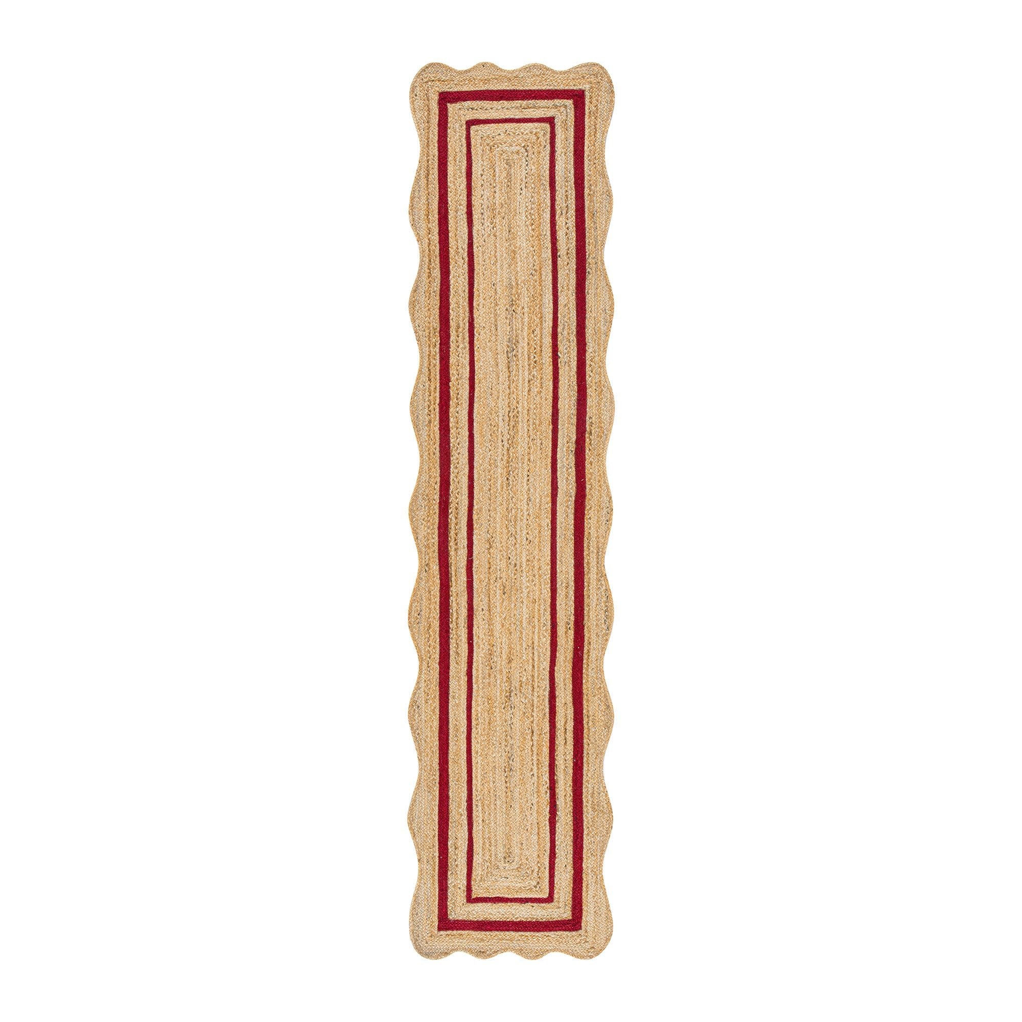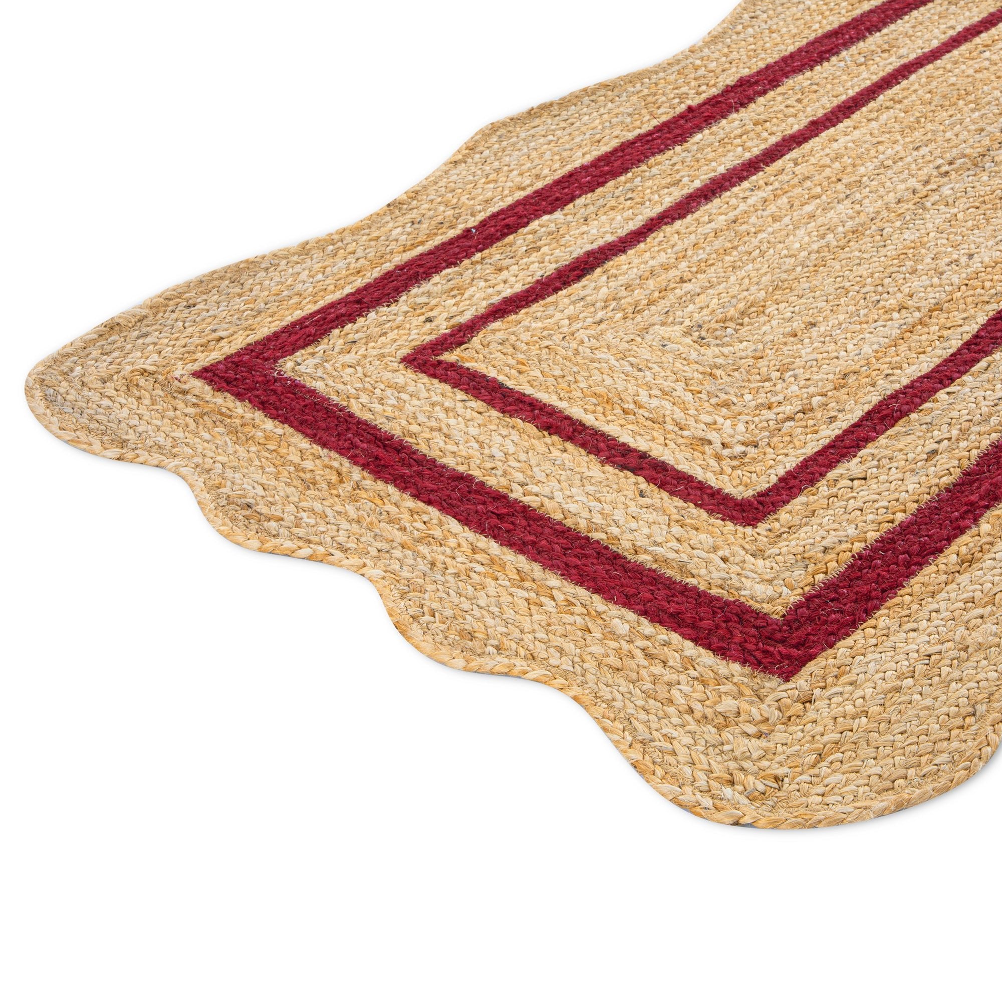 - Evie’s design is complemented by the classic scalloped edge and a striking scarlet red double border to add contrast to the natural jute.